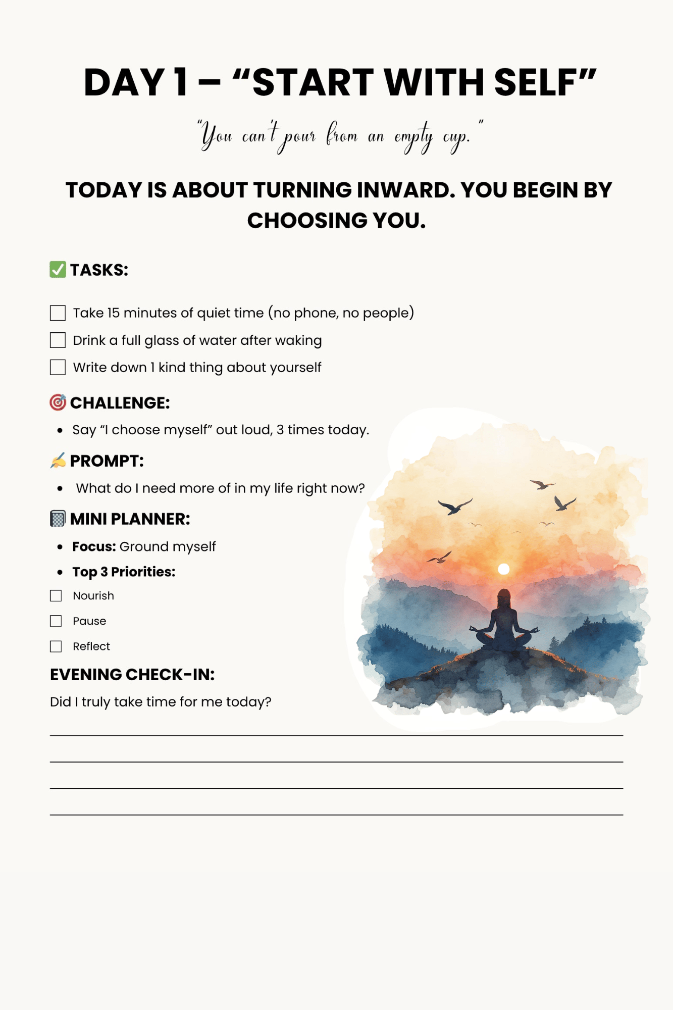 Sacred Pause: Her Season of Strength is a 30-day self-care challenge and guided journal created for women who are ready to stop surviving and start tending to their own needs again. Inside, you’ll find gentle, doable prompts and daily checklists that touch every part of your life—rest, mindset, body care, boundaries, joy, and reflection—so you’re not guessing what “self-care” should look like each day.