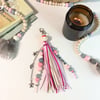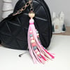 Portachiavi o ciondolo per borsa, realizzato in pelle rosa. Decorato con una piccola catena con ciondoli e palline colorate con una parola motivazionale.