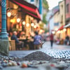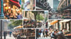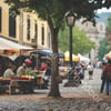 A street market scene, with outdoor seating, crushed stone streets, and historic buildings in the background.