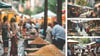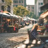 A street market scene with outdoor seating