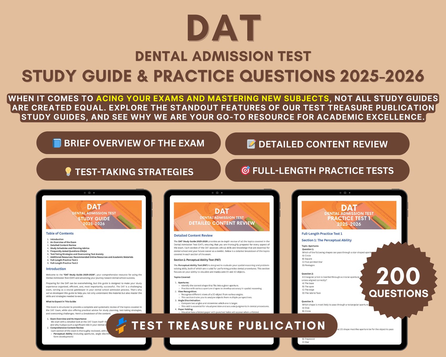 Prepare with confidence for the Dental Admission Test (DAT) Exam and unlock the door to your dream career in dentistry. Our meticulously crafted study guide is your trusted companion on the path to extraordinary success.