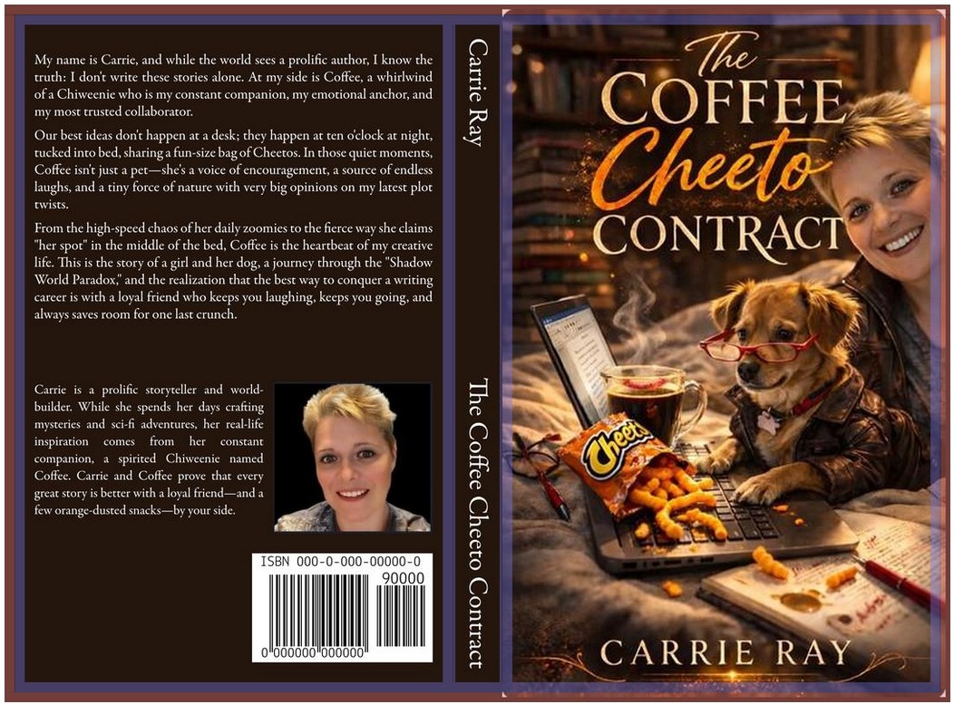 My name is Carrie, and while the world sees a prolific author, I know the truth: I don’t write these stories alone. At my side is Coffee, a whirlwind of a Chiweenie who is my constant companion, my emotional anchor, and my most trusted collaborator. Our best ideas don't happen at a desk; they happen at ten o’clock at night, tucked into bed, sharing a fun-size bag of Cheetos. In those quiet moments, Coffee isn't just a pet—she’s a voice of encouragement, a source of endless laughs, and a tiny force of nature with very big opinions on my latest plot twists. From the high-speed chaos of her daily zoomies to the fierce way she claims "her spot" in the middle of the bed, Coffee is the heartbeat of my creative life. This is the story of a girl and her dog, a journey through the "Shadow World Paradox," and the realization that the best way to conquer a writing career is with a loyal friend who keeps you laughing, keeps you going, and always saves room for one last crunch.