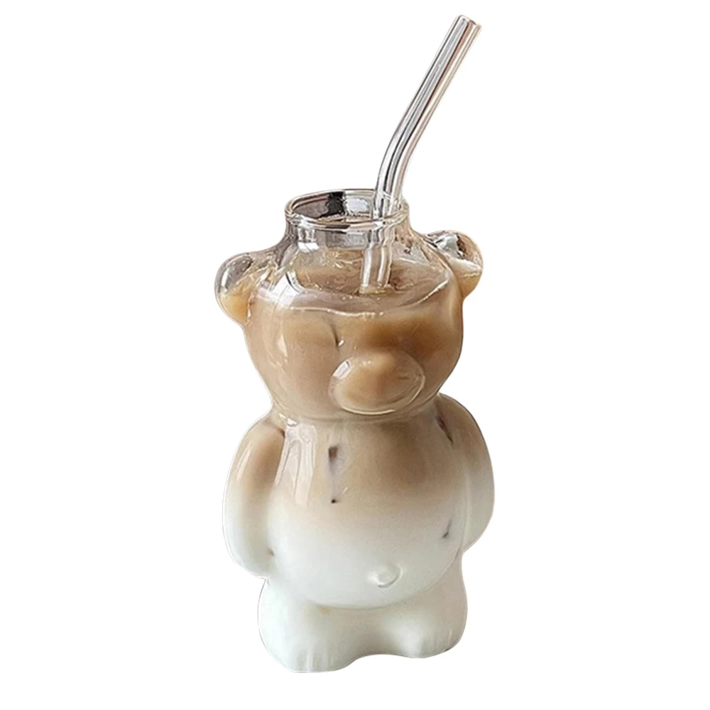 300ML Cute Bear Glass Coffee Mug with Straw – Transparent Drinkware Cup