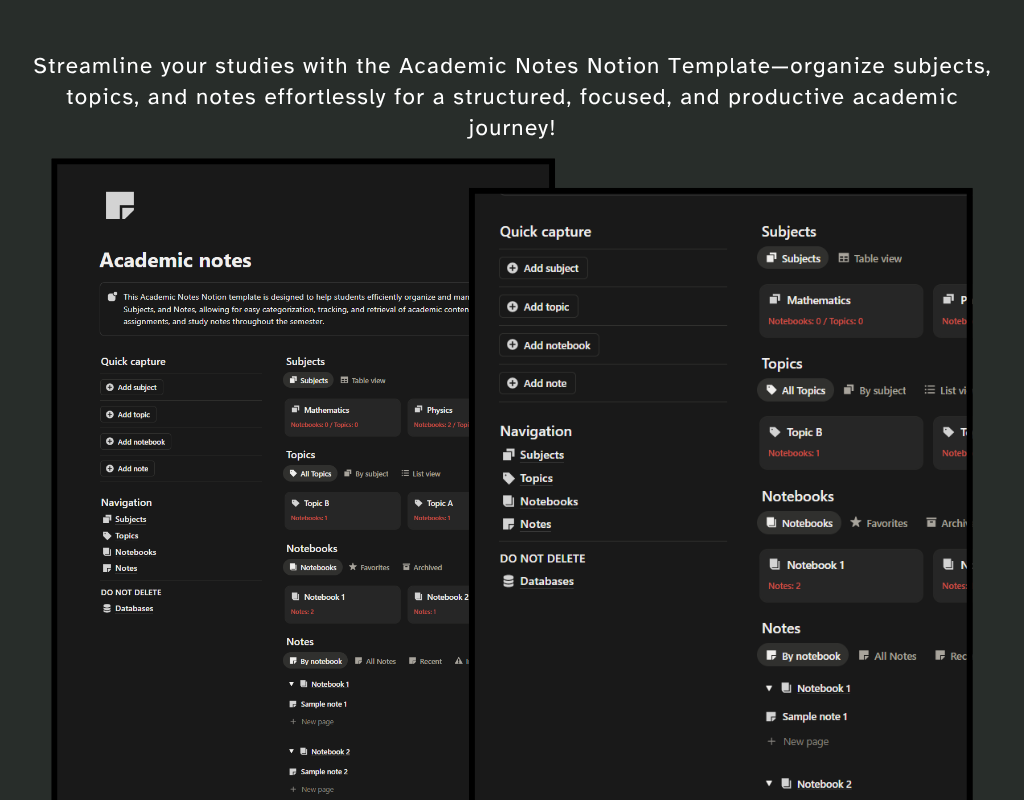This Academic Notes Notion template is an essential tool for students aiming to maintain a well-organized and efficient study system, enhancing their academic performance and productivity.