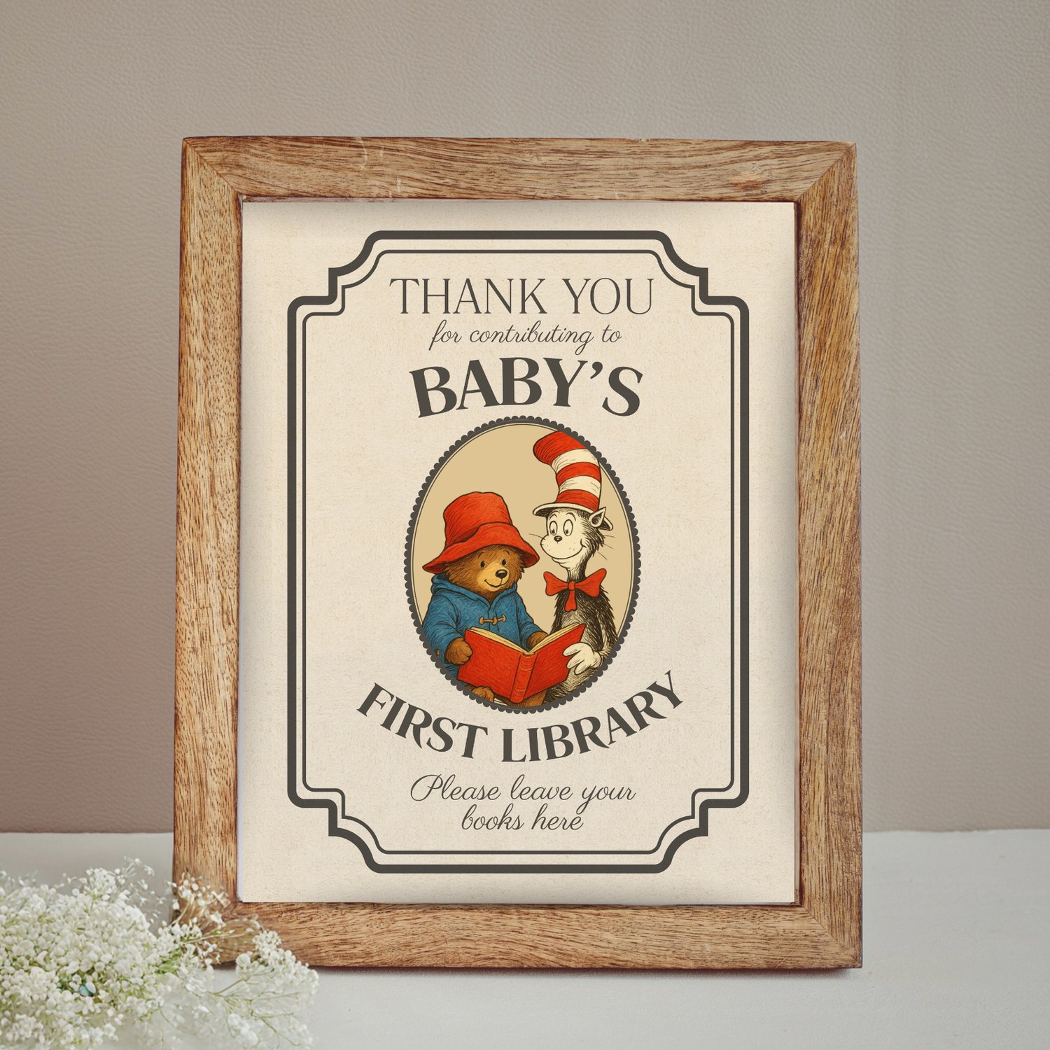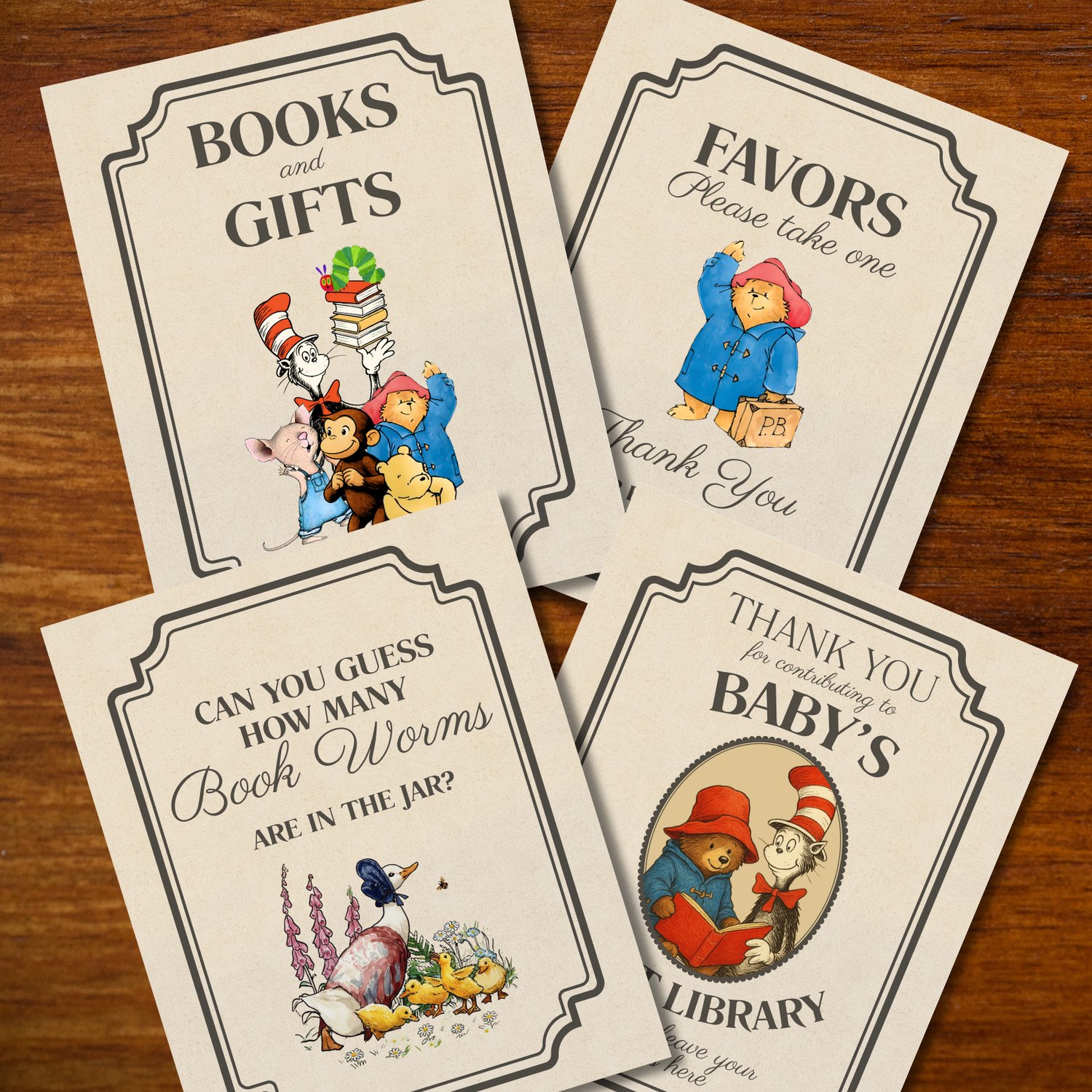Each sign features soft vintage tones, nostalgic illustrations, and elegant fonts — perfect for creating a “Baby’s First Library” or storybook baby shower theme.