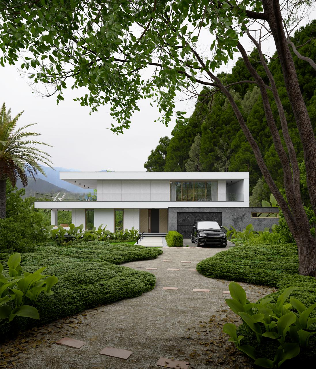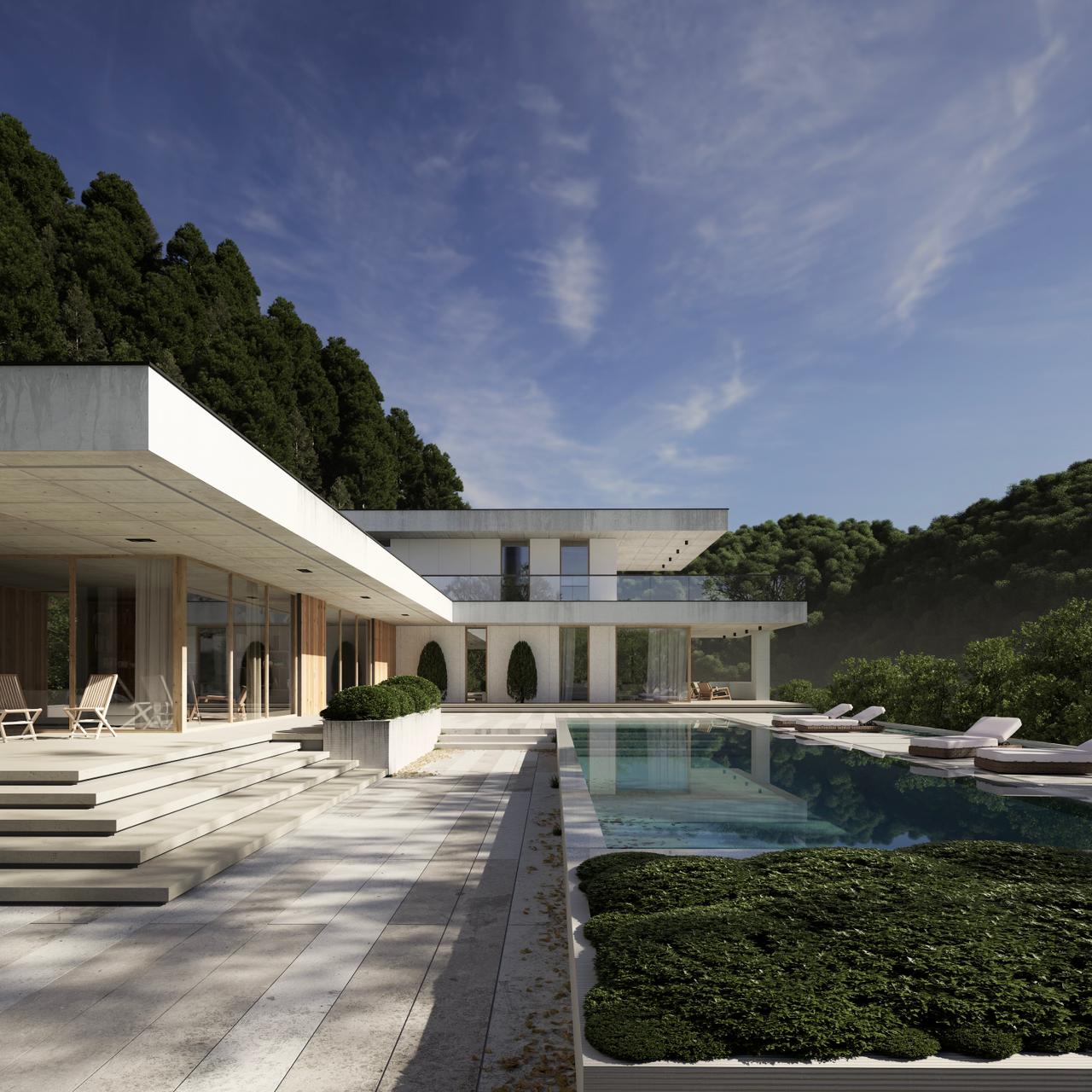 Aleksey Zhrazhevskiy House - 2 different file for 2 sides of the house. In this scene I have used the techniques that have never been seen or used before for the grass/bushes, background mountain with png, learn how to set different lighting settings for 2 kind of the weather for each house part, realistic pool, materials, decals and more!