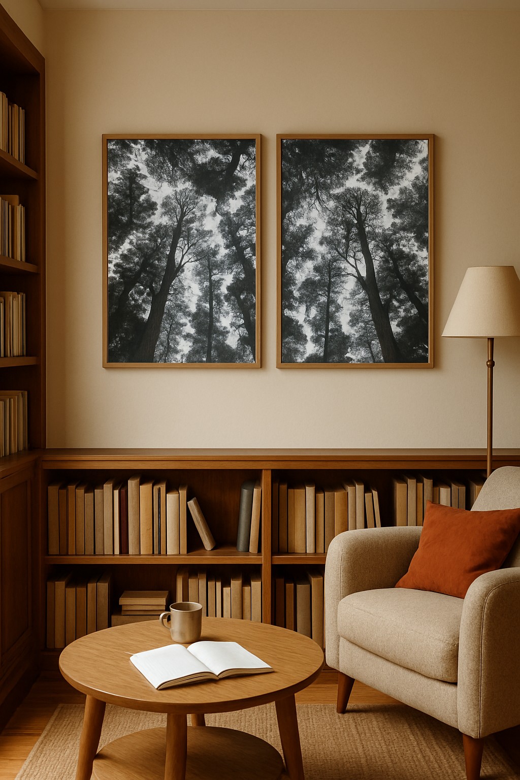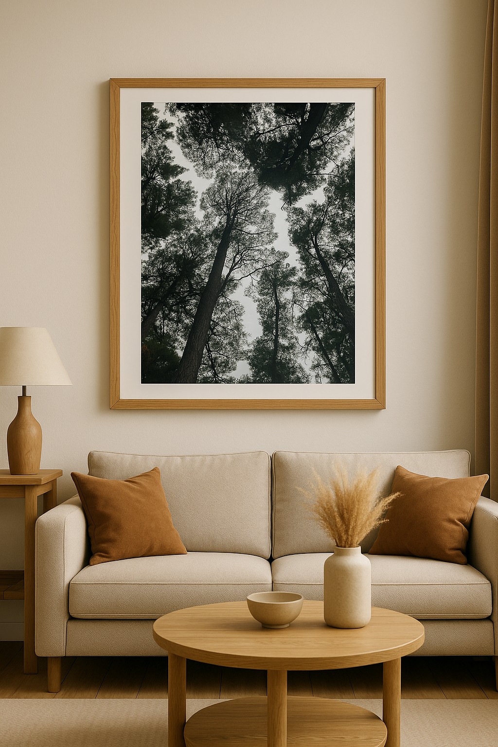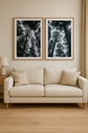 Bring a calming touch of nature into your home with this Pine Tree Forest Duo, photographed looking up through towering pines for a dramatic and grounding effect.