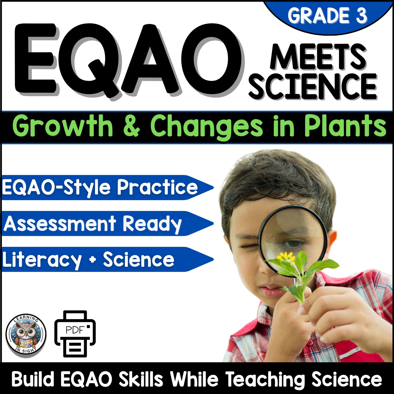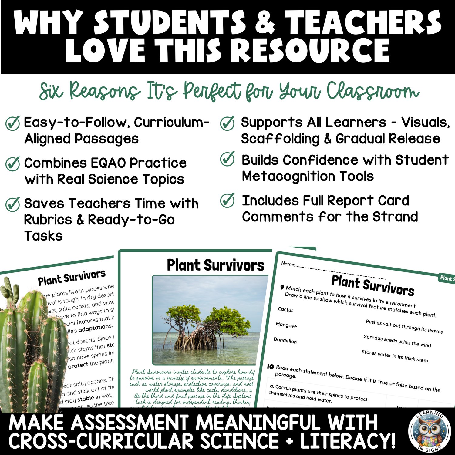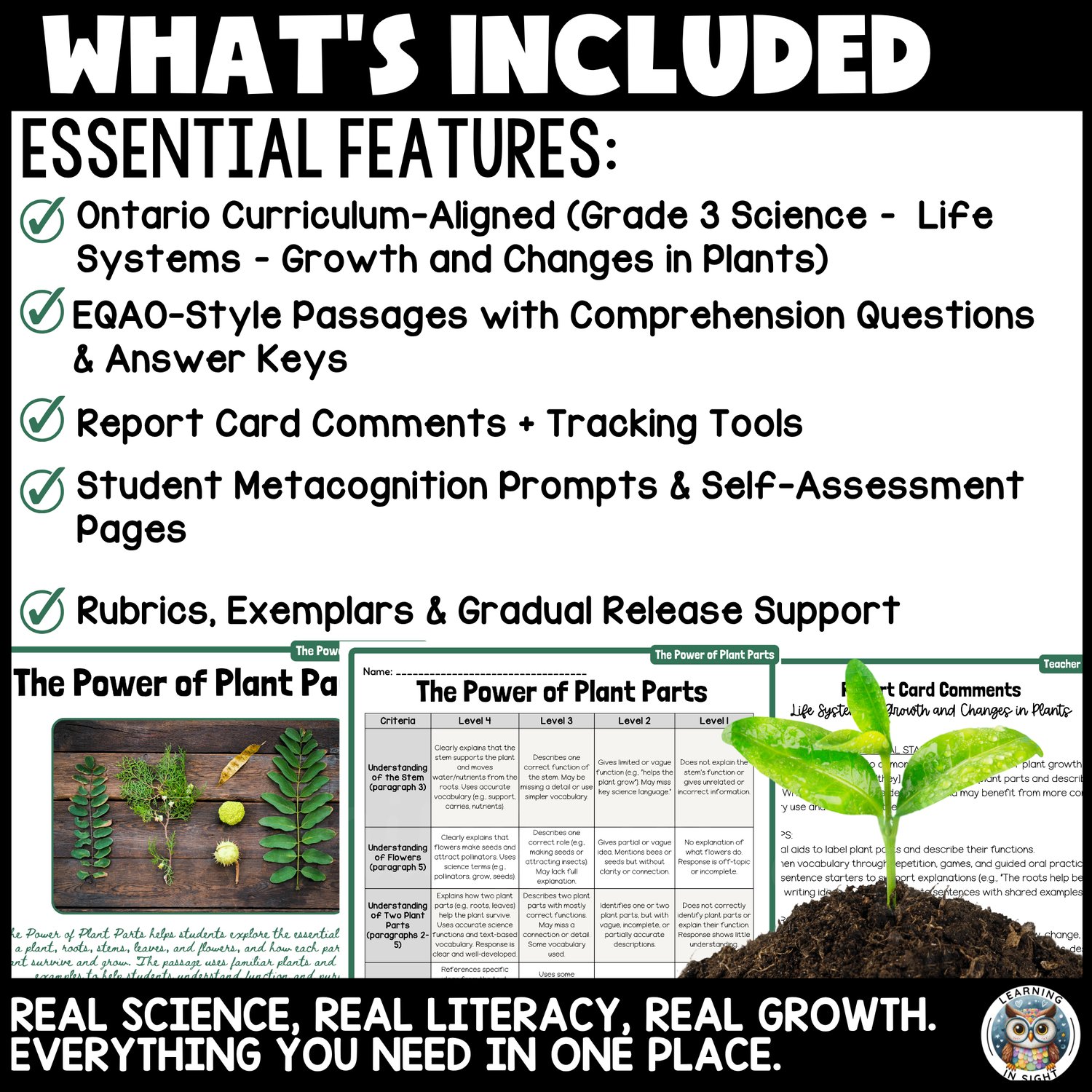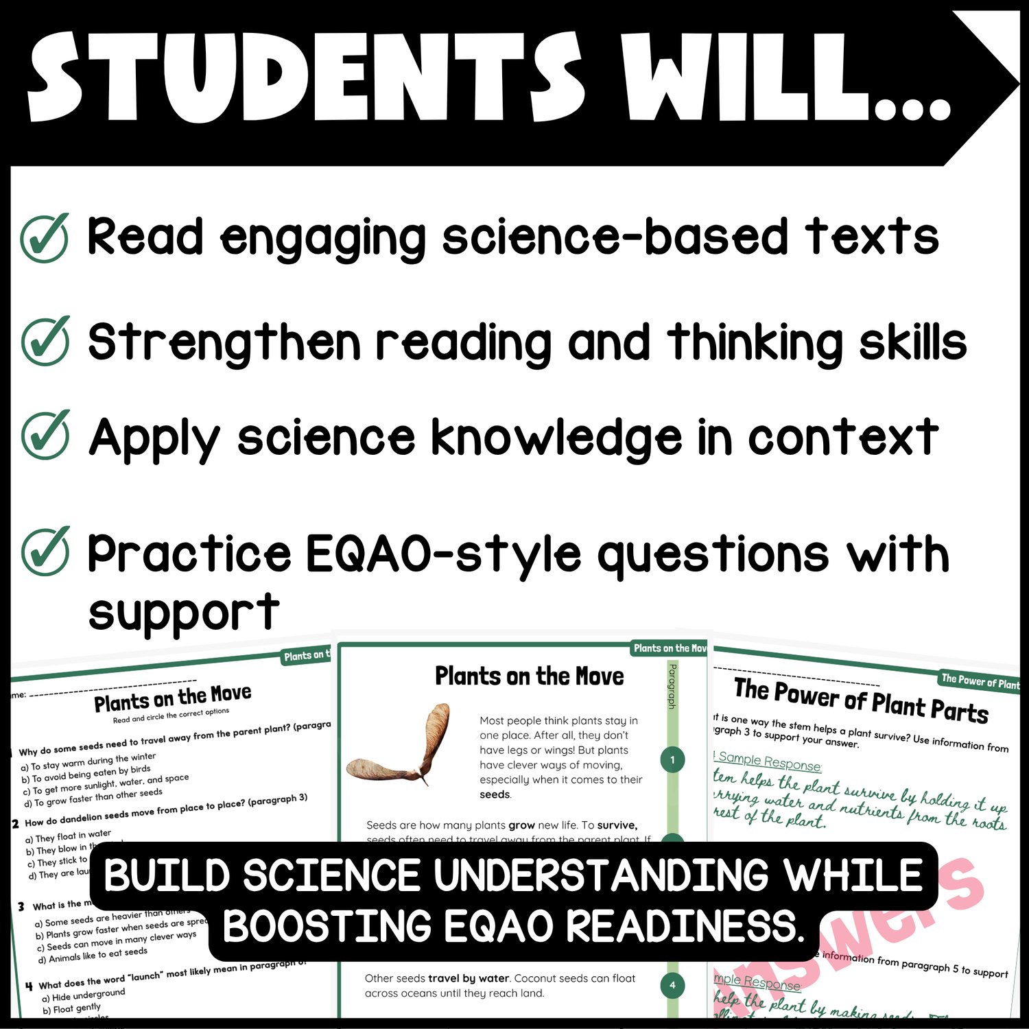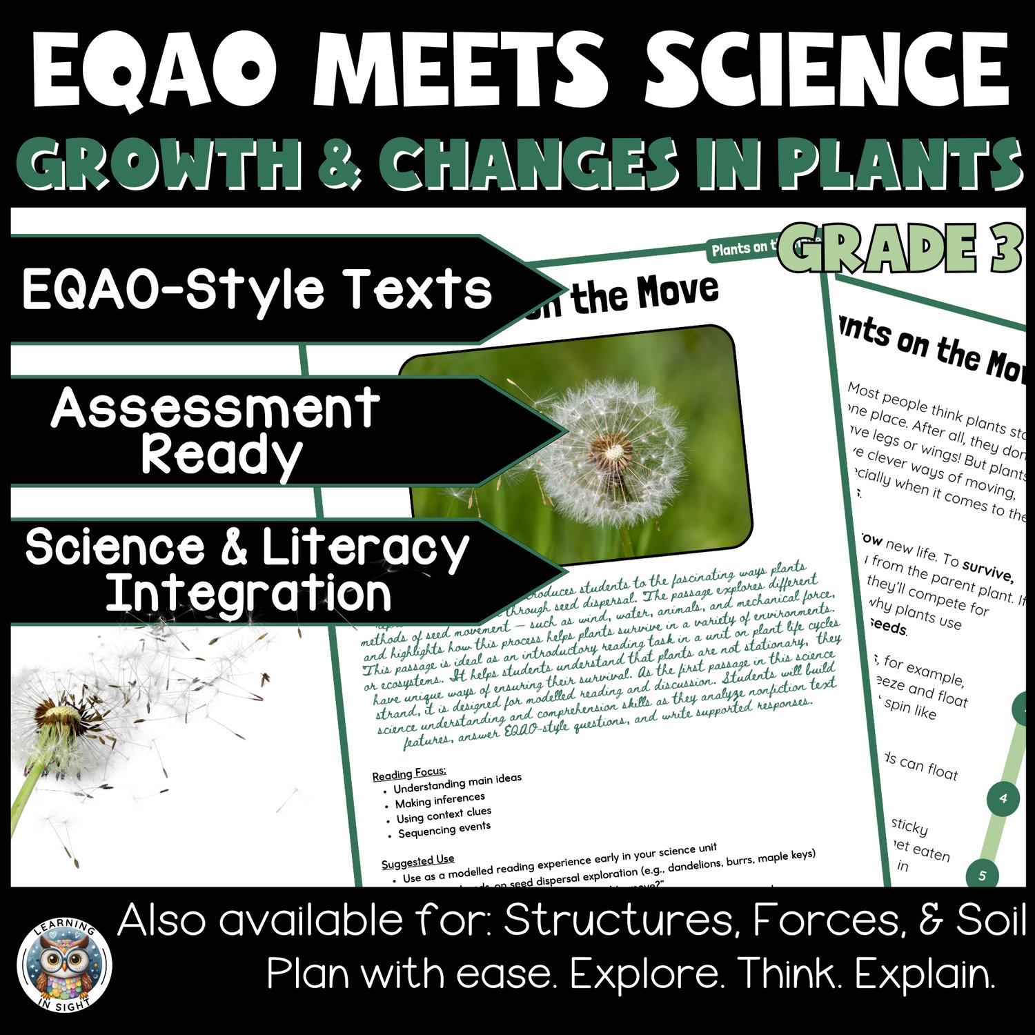 This cross-curricular resource blends the Growth and Changes in Plants strand from the Ontario Grade 3 Science curriculum with EQAO-style literacy practice. Through modelled, guided, and independent tasks, students deepen their understanding of plant life while building confidence with reading comprehension and written responses.