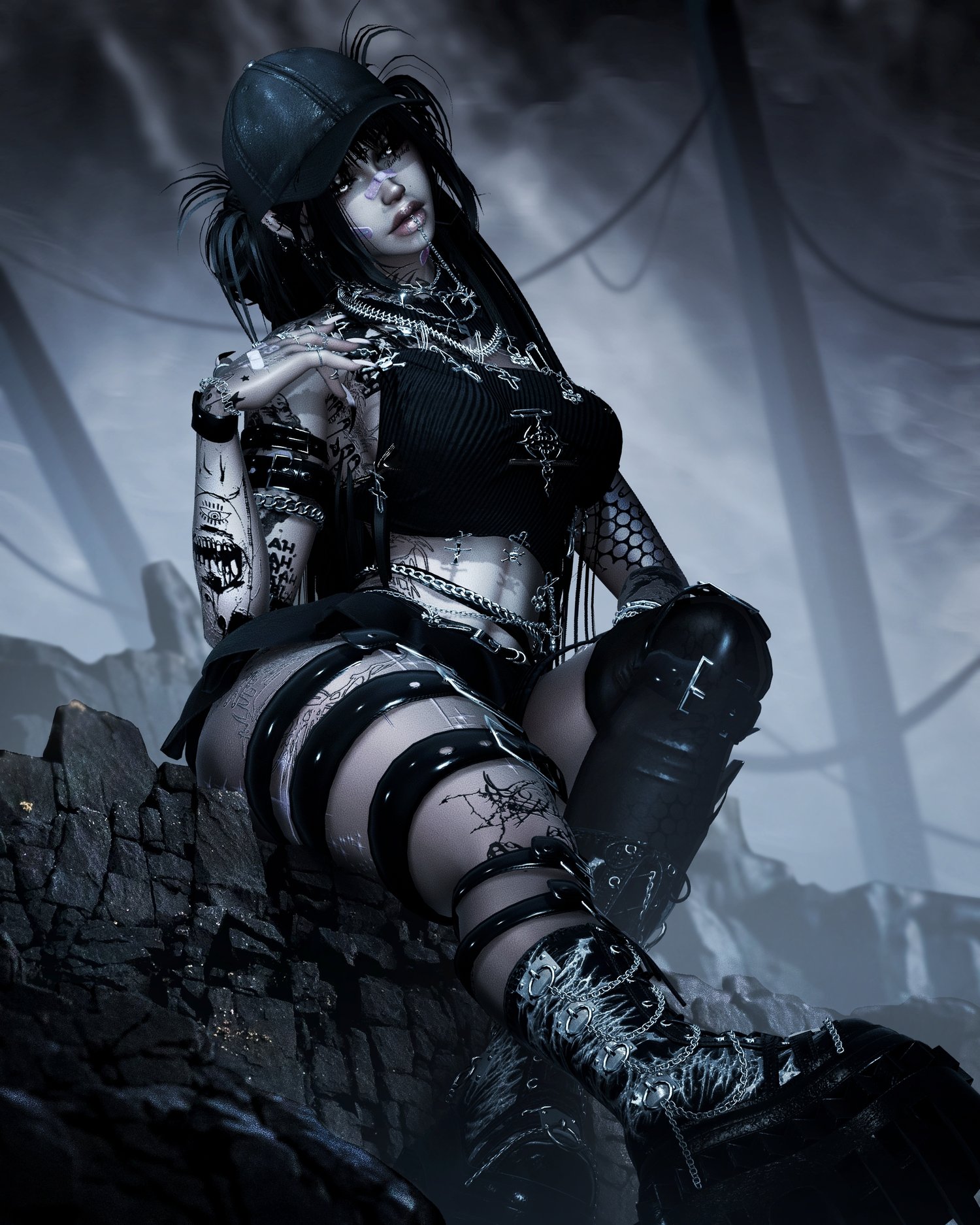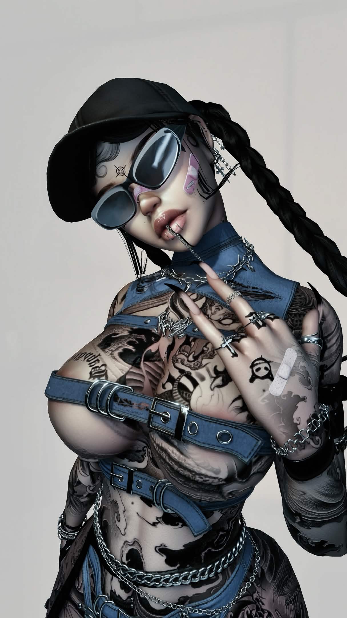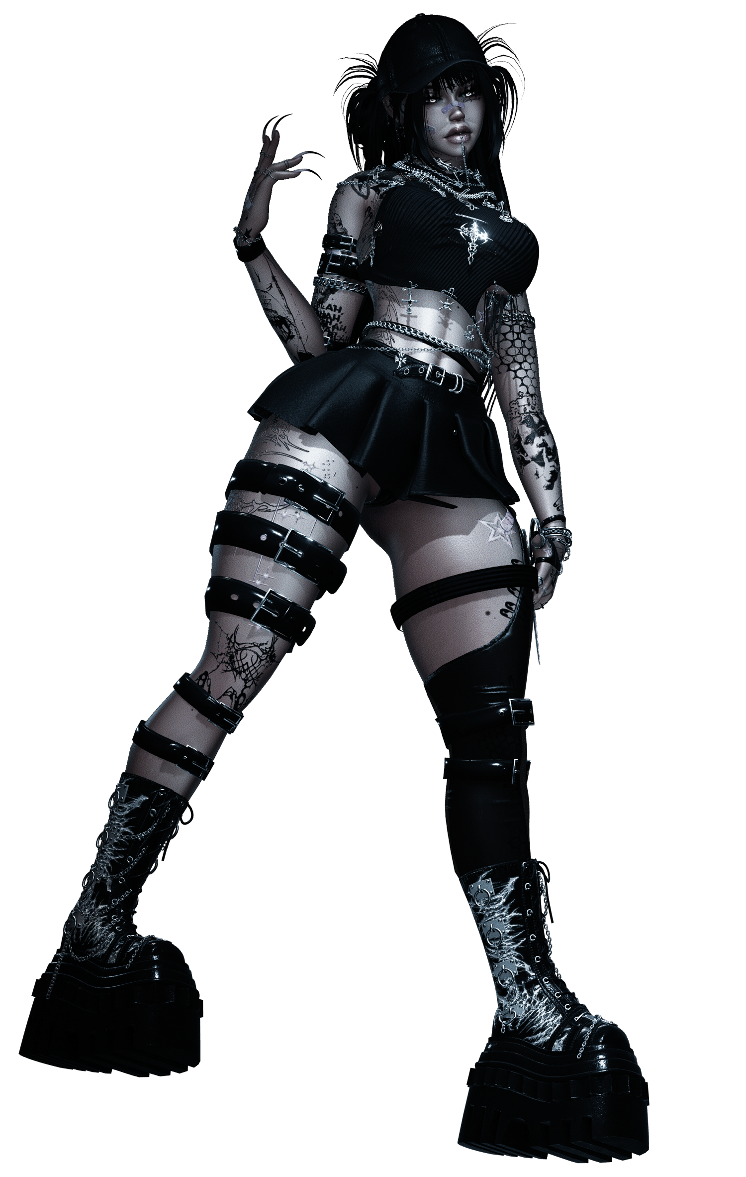 Clothes: Belt Top, Bra, Pasties, Belt Undies, Skirt, Band- Aids, Goth Chain, Face piercings, Mid Goth Stompers, Garter