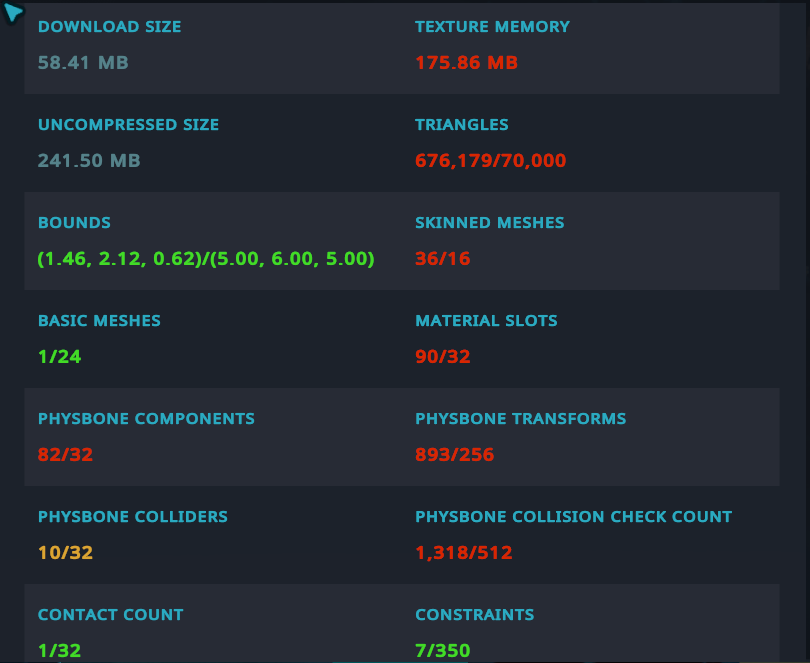 - This avatar is on the heavier side. In the future, I hope to be able to optimize more and hopefully eventually update this one with a more optimized version, but for now it remains pretty heavy. Please feel free to remove items that you don't want to bring the size down a bit.