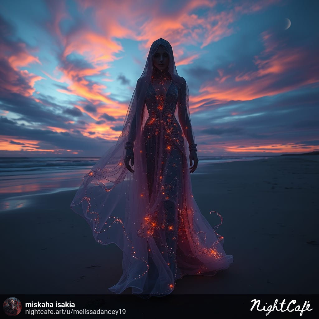 A hauntingly beautiful grim reaper, adorned in a gown woven from starlight, strolls along a desolate, windswept beach at twilight, her ethereal form partially transparent, with wisps of spectral energy swirling around her. The sky is awash in a kaleidoscope of colours, from fiery oranges and deep purples to soft pinks and ethereal blues. A surreal, dreamlike atmosphere hangs heavy in the air, with the distant sound of mournful echoes carried on the breeze and inspired by the cinematic and atmospheric styles of Greg Rutkowski and Alphonse Mucha, with a touch of dark fantasy and gothic elements.
