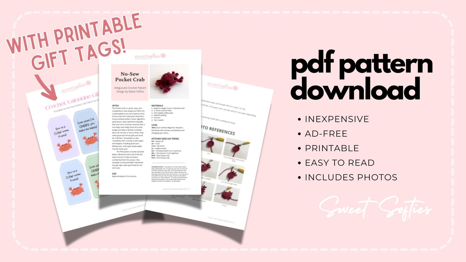 The PDF pattern includes detailed photo references and a link to the full video tutorial to help crocheters confidently finish this project. Also included is a free printable: Valentine’s Day gift tags made specifically for the mini crab.