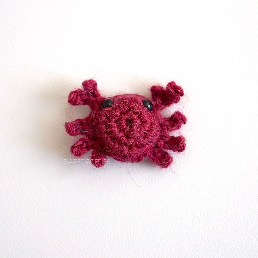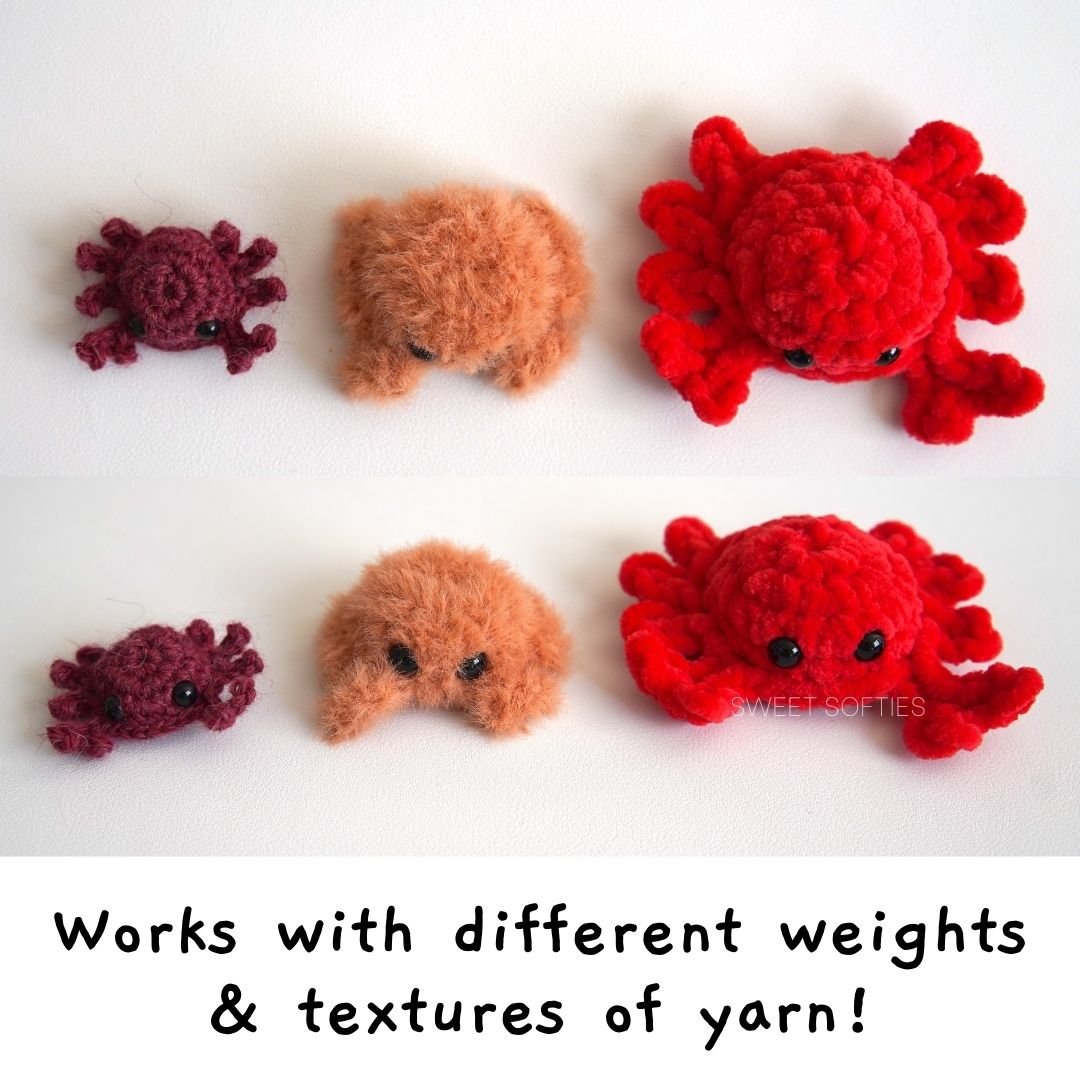 The Pocket Crab is a quick, easy, and completely no-sew amigurumi! With this crochet pattern, you can create an army of tiny crabs that make great keychains, funny stocking stuffers, Easter egg fillers, party favors, class Valentine’s Day gifts with and more. Surprise someone with a mini baby crab today! Since this small amigurumi takes a familiar crocheter about 20 minutes or less to finish, they make great last-minute gifts and stock for craft fairs. This pattern is also compatible with a variety of yarn types and weights, including plush yarn, blanket yarn, and super bulky weight chenille velvet yarn.