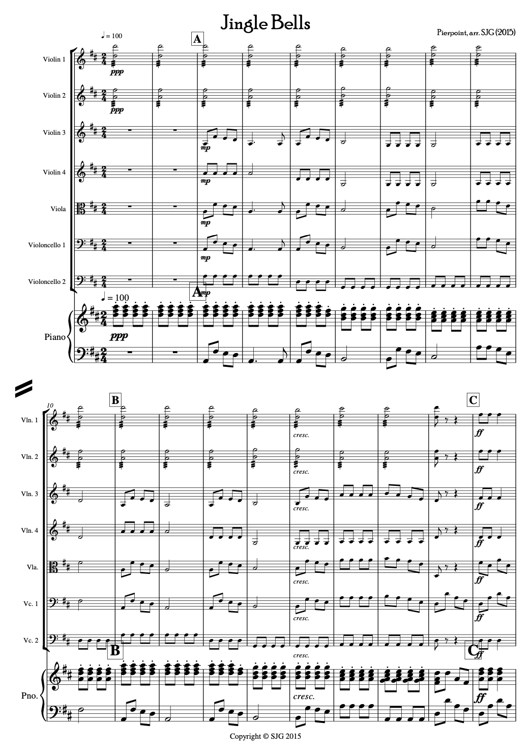 Music for Christmas. A fun and satisfying arrangement of Jingle Bells, for mixed standard string musicians. Integral piano accompaniment allows great flexibility: everyone from beginner to those with several years experience can be included within one ensemble - there is something for everyone! Suitable for primary or secondary school music departments and string programs, or for private studio use.