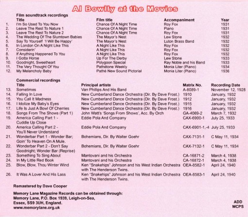 Al Bowlly made very few film appearances, but here are the soundtracks from those that have been unearthed so far, plus many other rare recorded performances all gathered together for the first time anywhere.