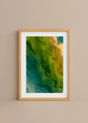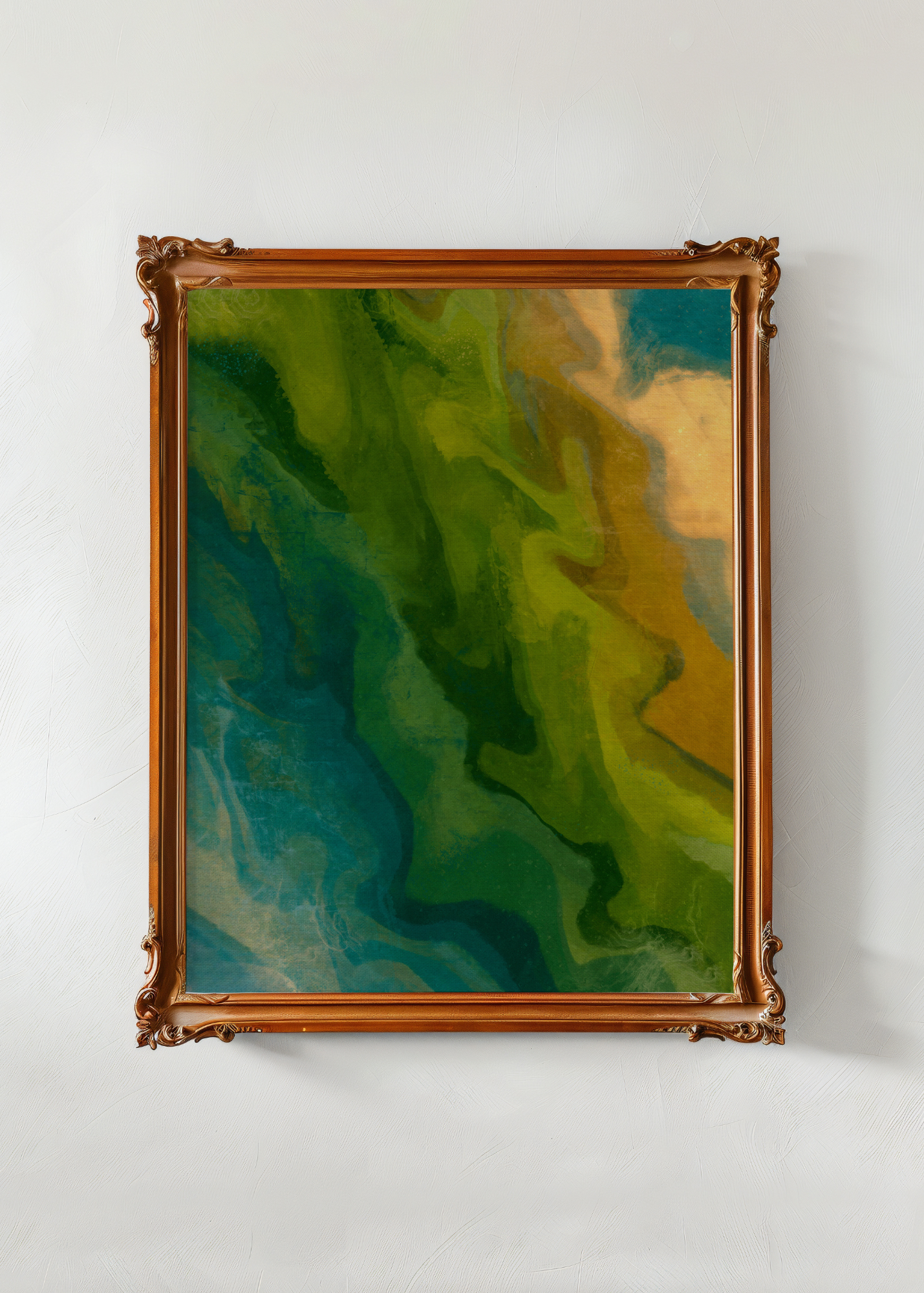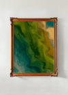 Riverlight— Swirls of deep forest green, moss, turquoise, and sunlit gold ripple across this abstract composition like light bending over water. “Riverlight” evokes the serenity of earthbound flow—mysterious yet gentle, like sunlight filtering through a canopy and glinting on a winding stream. It's a soothing yet dynamic piece that invites quiet reflection and grounding presence. Perfect for creating a calm, nature-inspired atmosphere wherever it lives.