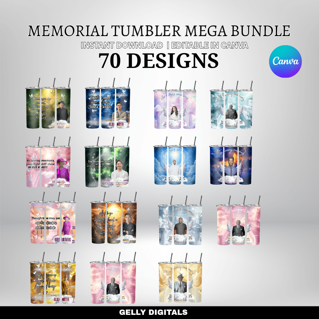 Keep memories alive with the Memorial Tumbler Mega Bundle — a collection of 70 beautifully designed tumbler templates, fully editable in Canva. Each design is crafted to help you create meaningful and personalized tributes for loved ones.