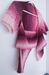 The shrug is worked sleeve to sleeve and the hem (or collar) is worked in later. No seams!