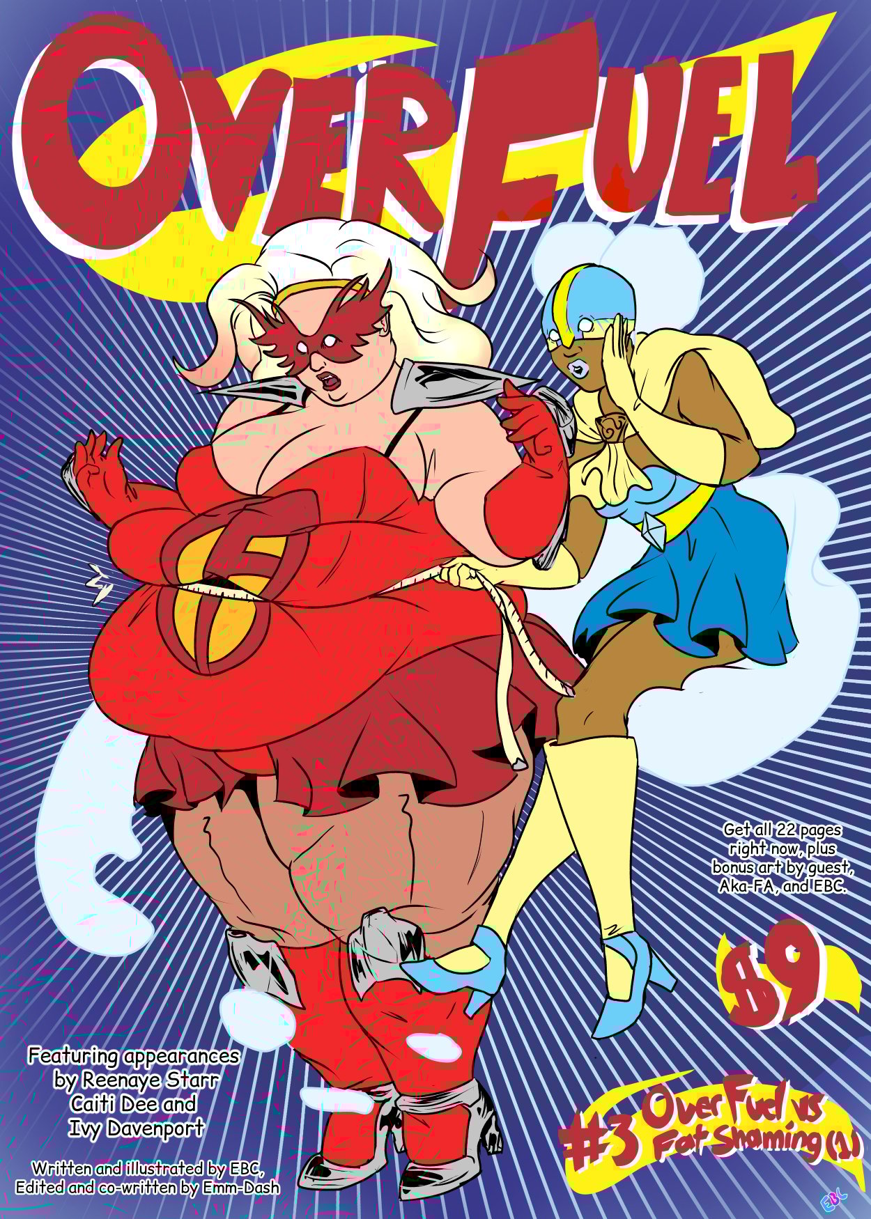 OverFuel is back and bigger than ever in OverFuel Issue 3: OverFuel vs Fat Shaming (1), another installment in the superhero, fat fetish, comedy parody comic by ExtraBagageClaim. In this issue of the exciting comic, Candace finds out that she's thought to be a feedee by the feederism community because of how quickly she's piled on so much weight. She takes on these problems, as well as media perception and the sinister dietitian Olympia's machinations. This Issue also introduces several new heroes onto the scene, including Sleet, a Quebecois heroine with the ability to control and condense clouds and vapor matter.