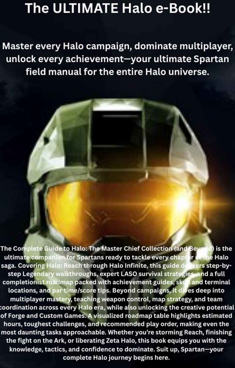 Step into the armor of humanity’s greatest hero with the most comprehensive companion ever created for the Halo saga. The Complete Guide to Halo: The Master Chief Collection (and Beyond) is a deep-dive strategy, lore, and achievement roadmap designed for players of every skill level — from first-time recruits to seasoned Spartans.