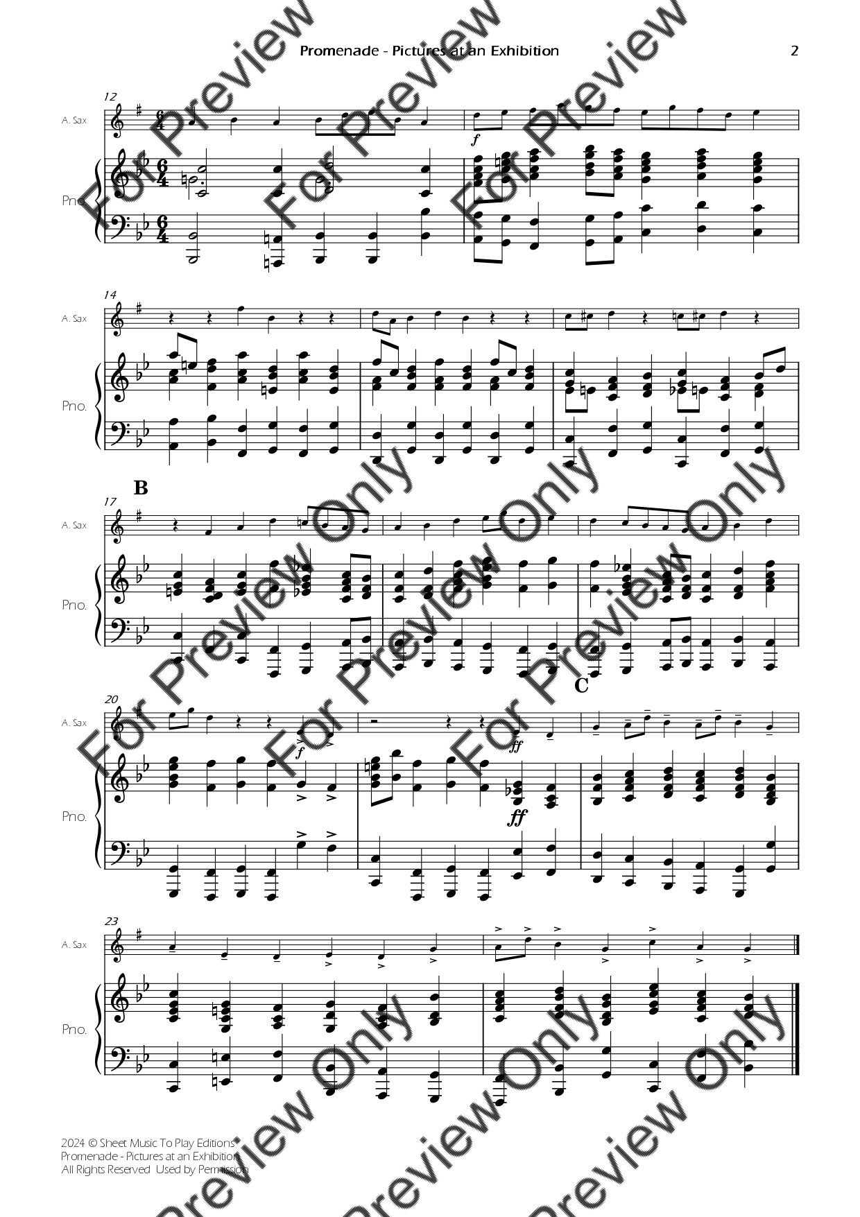 Promenade from Pictures at Exhibition by Mussorgsky and Ravel. Arrangement for Alto Saxophone and Piano. With Full Score and Individual Parts. Have fun!