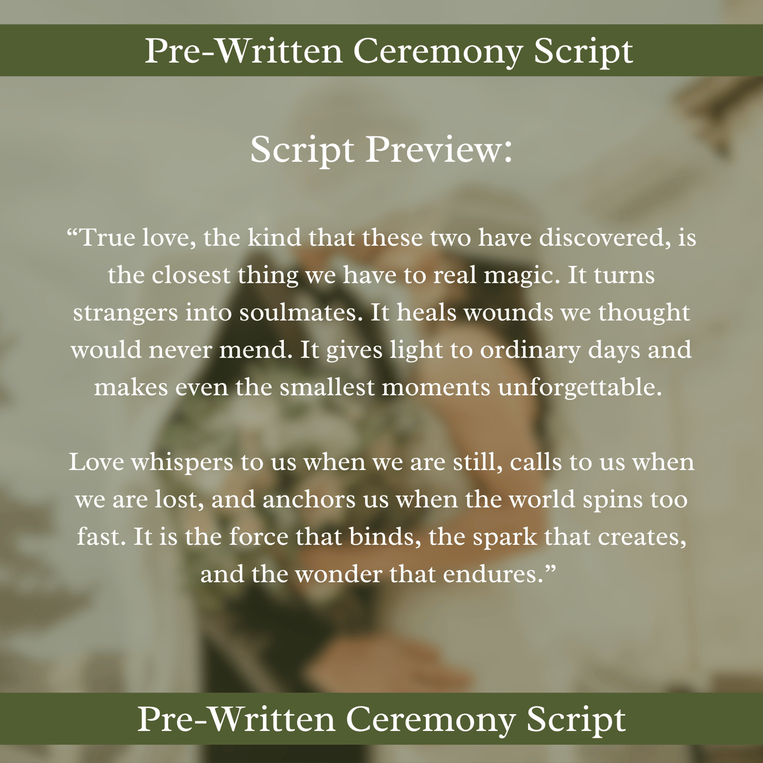 - Personal Use Only: All ceremony scripts are licensed for personal use only. Scripts may be performed by the couple, their chosen officiant (e.g., friend or family member), or shared with their wedding planner for the purpose of officiating one ceremony only.