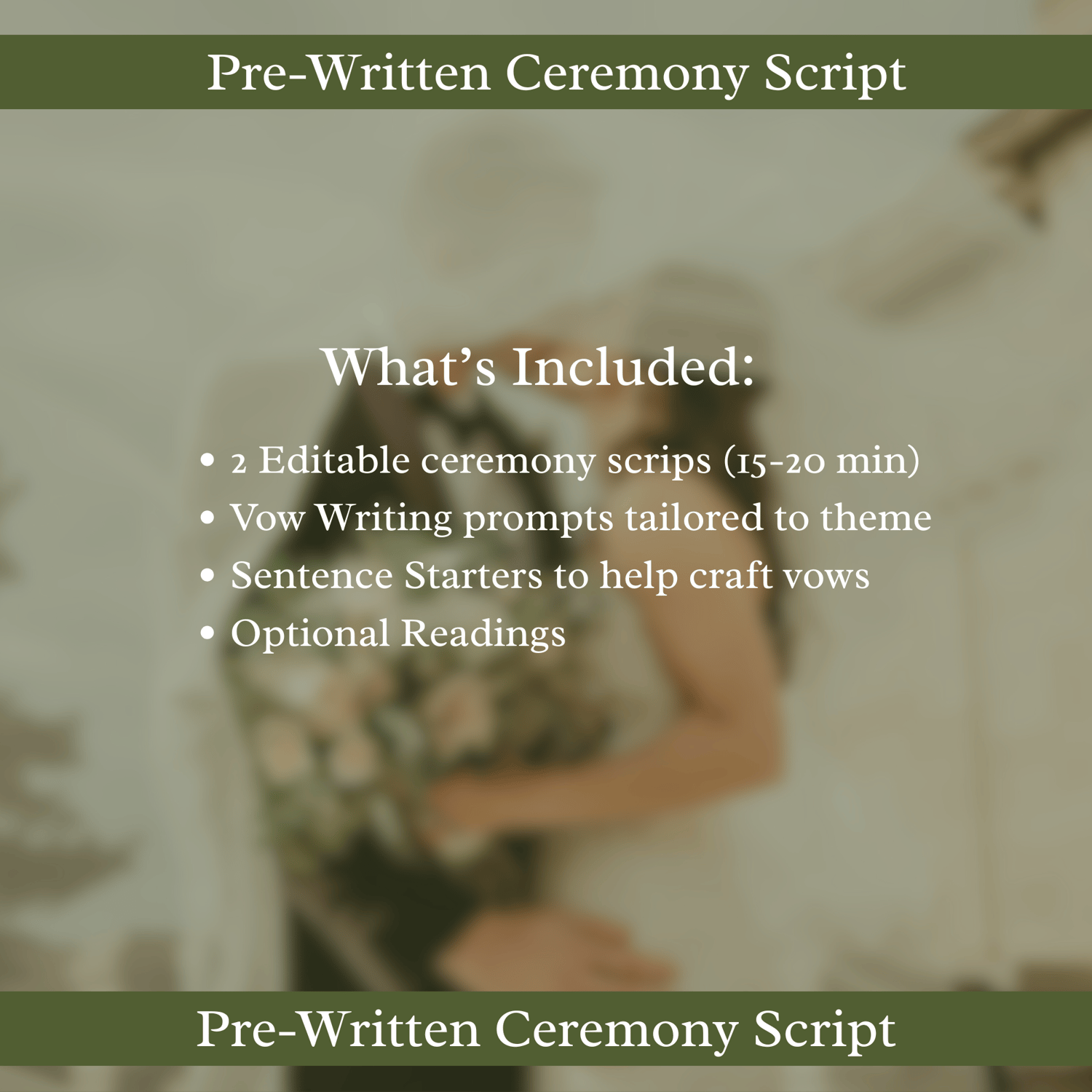 - 2 unique ceremony scripts (each fully editable, ~15–20 mins)