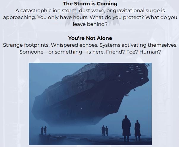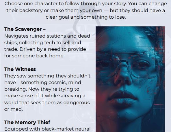 Threshold: Broken Orbit is a writing adventure set in a crumbling sci-fi universe where every decision shapes your story. Choose a character, explore eerie settings, and face survival challenges that force hard choices. Your mission? Write to survive. Survive to transform.