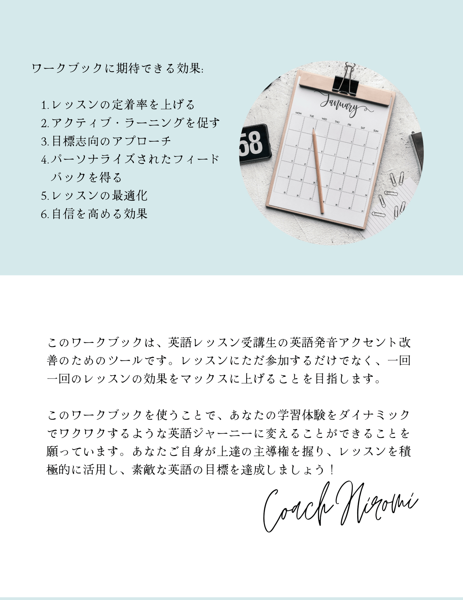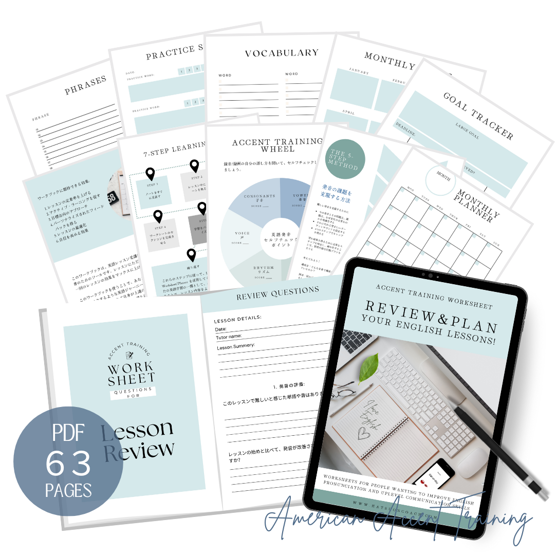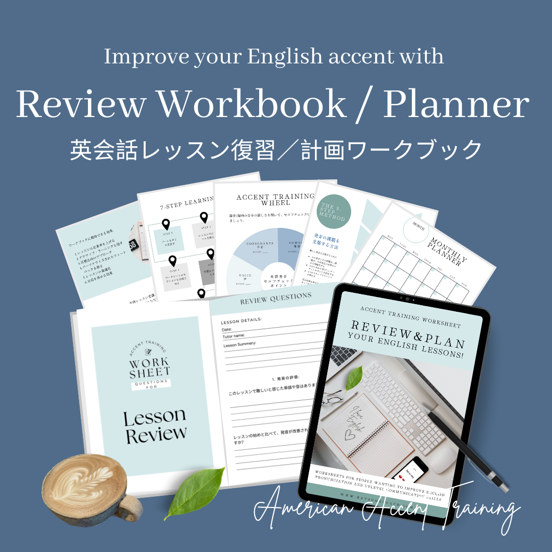 オンライン英語レッスン復習/計画ワークブックをご紹介します。このワークブックは、毎回のレッスンの可能性を最大限に引き出し、発音とアクセントをレベルアップさせたいと思っている方のためのものです。