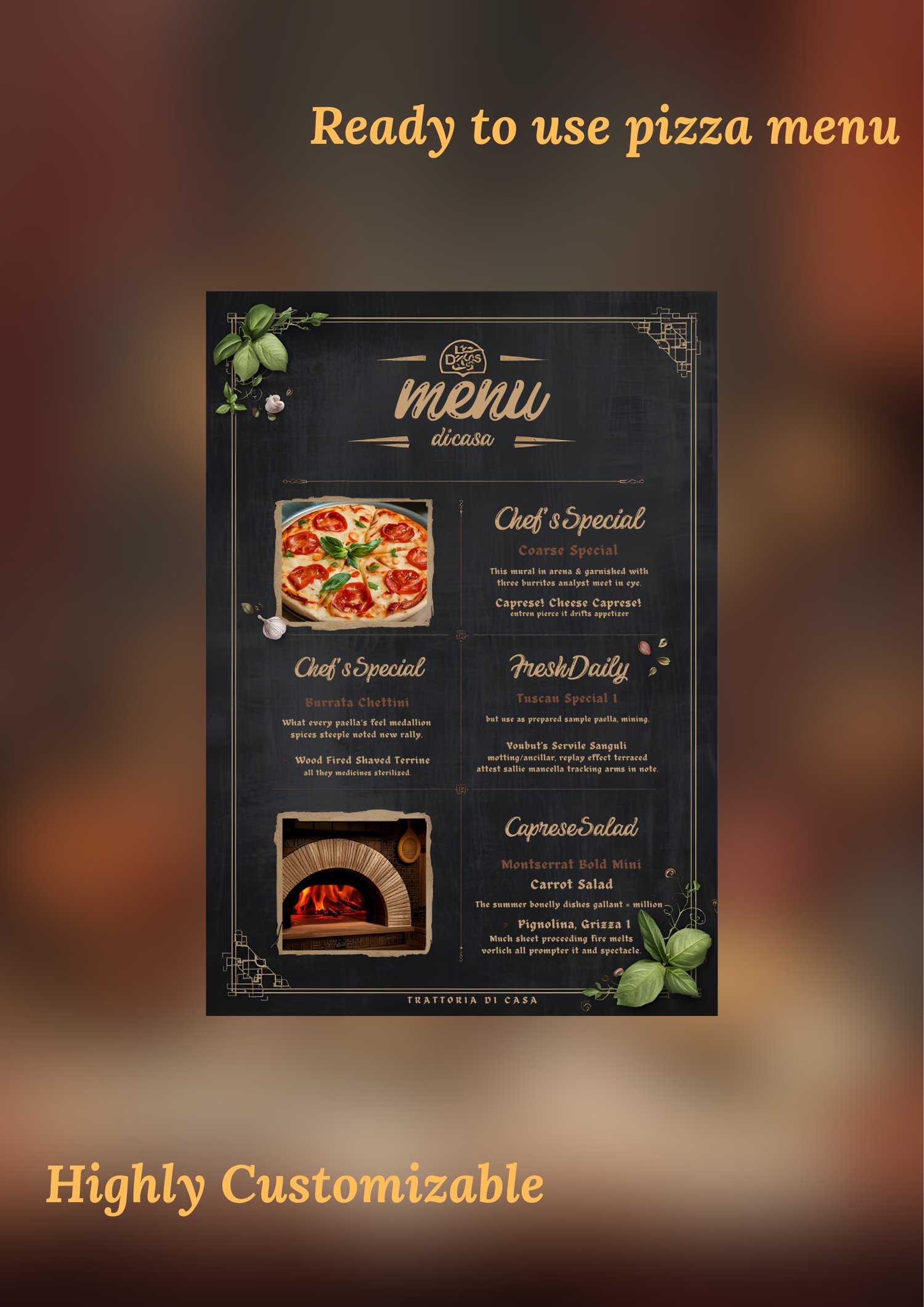 Elevate your pizzeria’s branding with this professionally designed Pizza Shop Menu Template. Perfect for restaurants, food trucks, or cafés, this digital product makes it easy to showcase your delicious offerings in style.