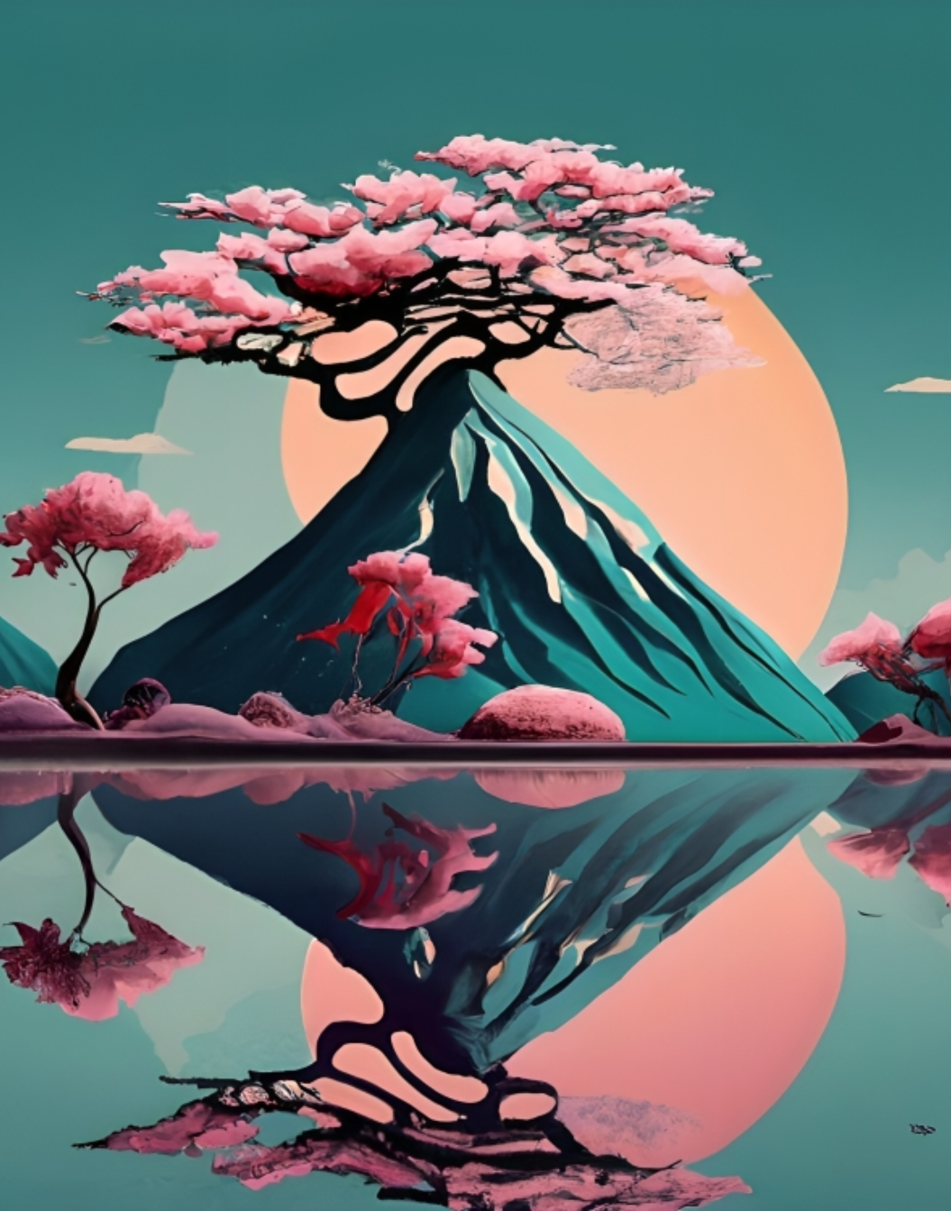 Japanese Style Painting, Mount Fuji, Japanese Landscape, River, Mountain, Vintage Village, Top Art, Nostalgic Rural life, Nature, Cool Nature, Beautiful Nature, Sunrise, Natural Landscape, Wall Art, Digital Art.