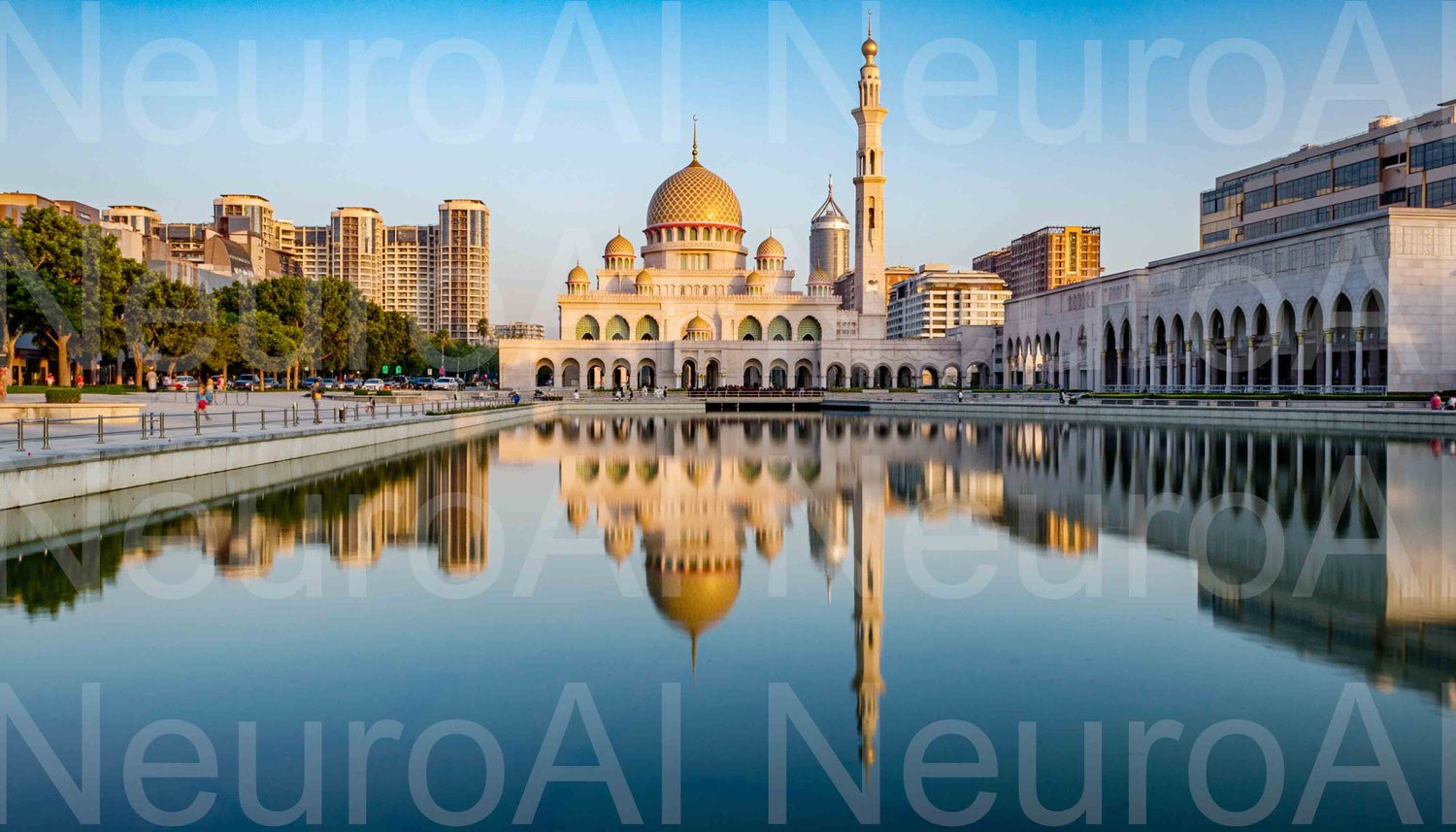 Stunning mosque reflecting in water at sunrise