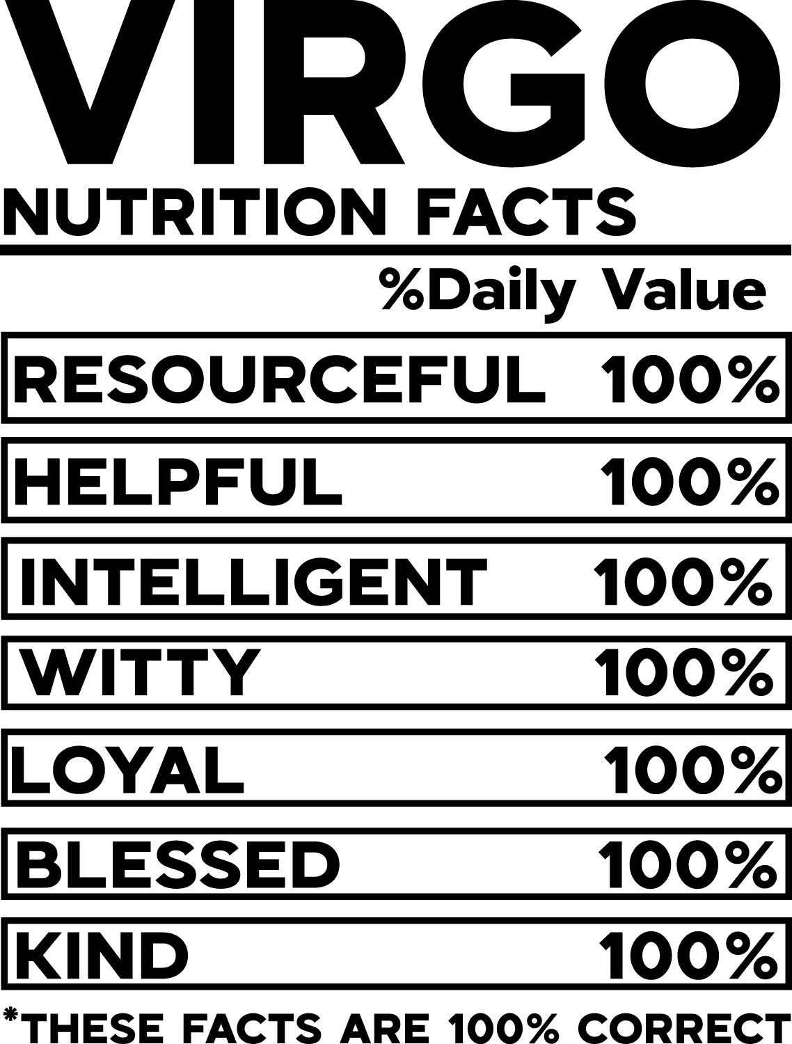 Showcase the organized, intelligent, and thoughtful personality of a Virgo with this “Virgo Nutrition Facts” design. Clean, crisp, and perfectly structured — just like a Virgo.