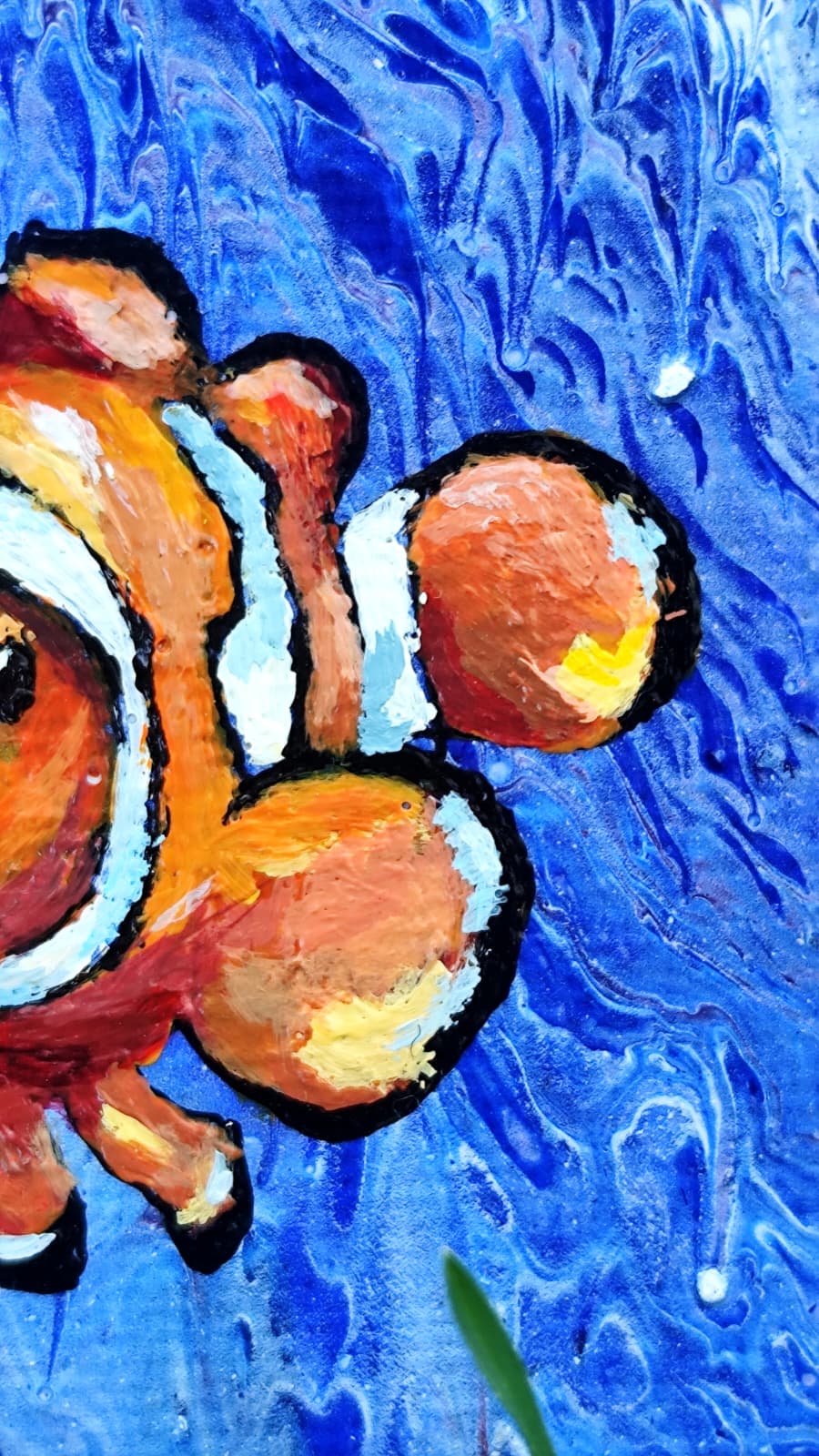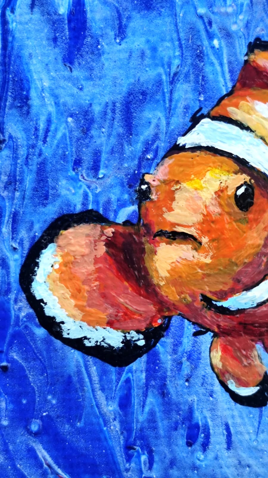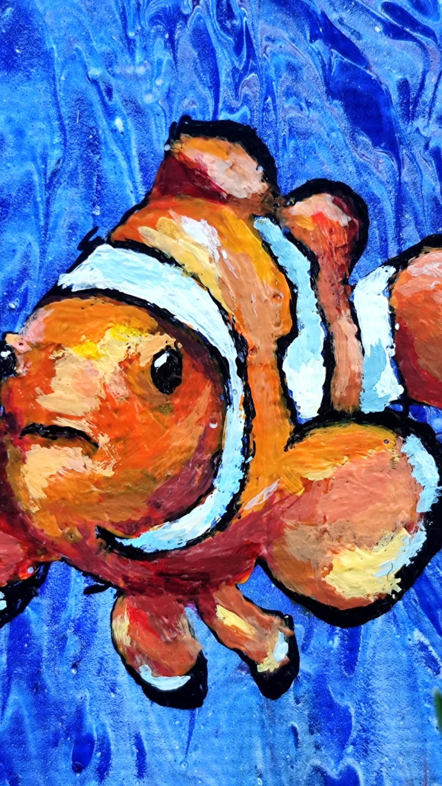 Inspirado en la vitalidad y el encanto del pez payaso, esta obra destaca por sus colores intensos y llenos de vida. Sus tonos naranjas y blancos contrastan con un fondo que evoca el movimiento del agua, creando la sensación de que el pez está nadando libremente entre pinceladas de color.