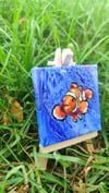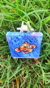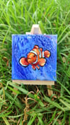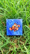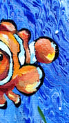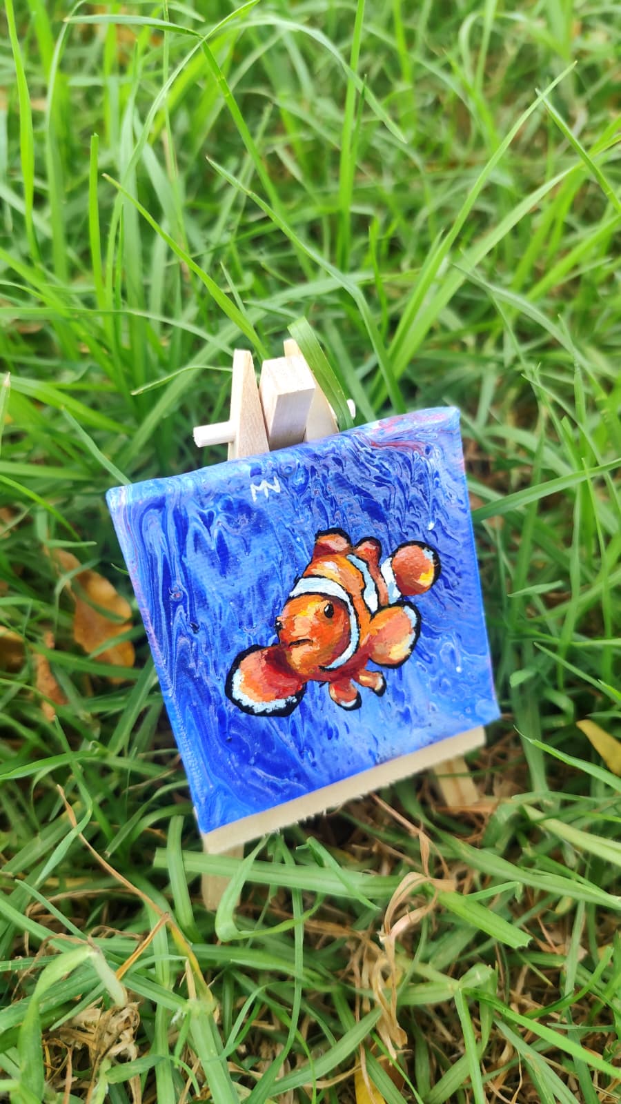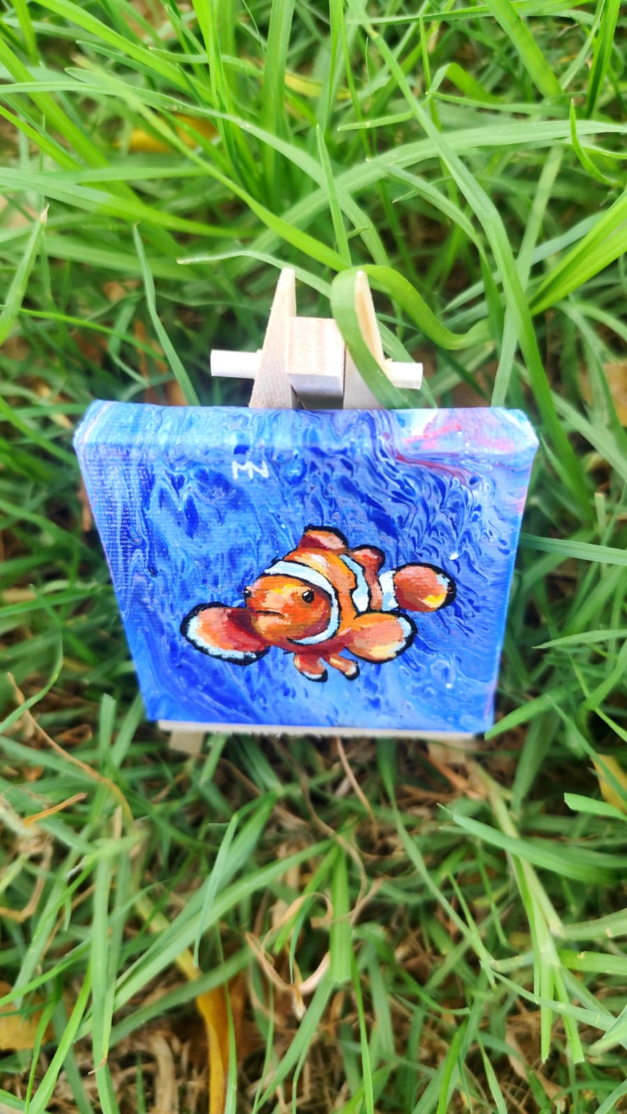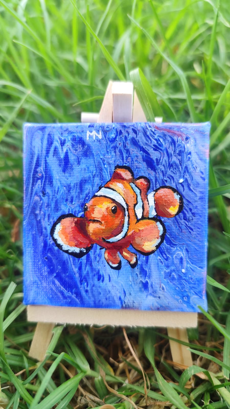 Inspirado en la vitalidad y el encanto del pez payaso, esta obra destaca por sus colores intensos y llenos de vida. Sus tonos naranjas y blancos contrastan con un fondo que evoca el movimiento del agua, creando la sensación de que el pez está nadando libremente entre pinceladas de color.