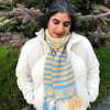 Aejej is a Moroccan desert whirlwind so vicious that the fellahin (peasants or farmers, derived from the Arabic word for ploughman or tiller) are said to defend themselves against it with knives. You can defend yourself in the wind much more stylishly with this scarf. Knit in two pieces and grafted together at the neck, the design uses simple stripes and stranded knitting, representing both the desert sun and the whirlwind, transitioning between circular and flat knitting to double the fabric in some sections for extra warmth.