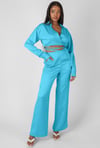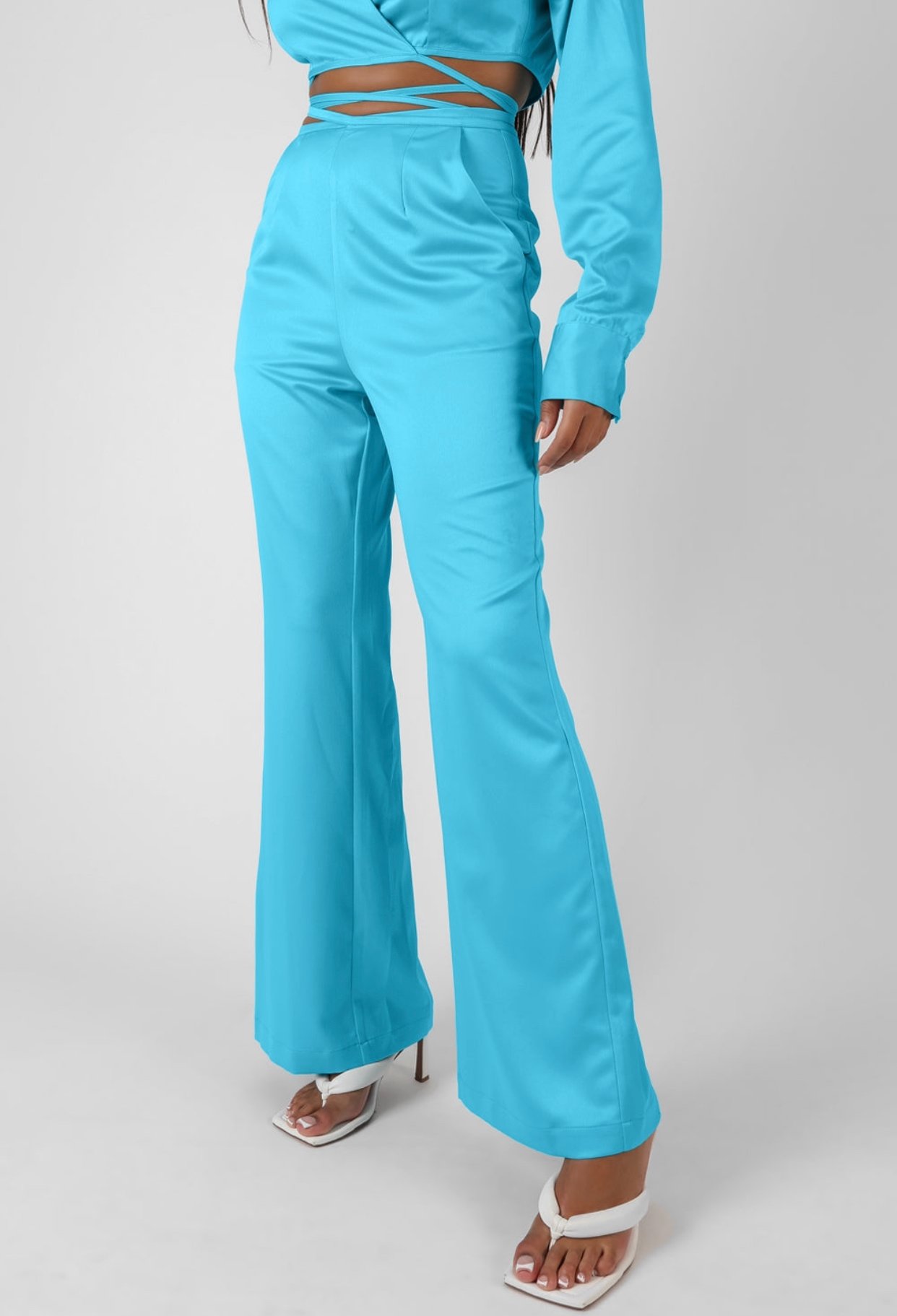 High waisted straight leg trousers in blue satin with a strappy waist detail.
