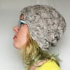 Circumference for the smaller size (aran weight only) is approx 17 inches / 43 cm lying flat, fitting an 18 inch / 46 cm head size loosely, stretching to fit a head up to around 20 inches / 51 cm.