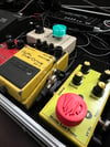 Ho disegnato questi tappi per avere una superficie più ampia di pressione e nel file stl e 3mf con un foro sia da 10mm (per la maggior parte dei pedali tipo stompbox) e con foro da 11mm per alcuni pedali (pochissimi) che hanno il footswitch più largo.