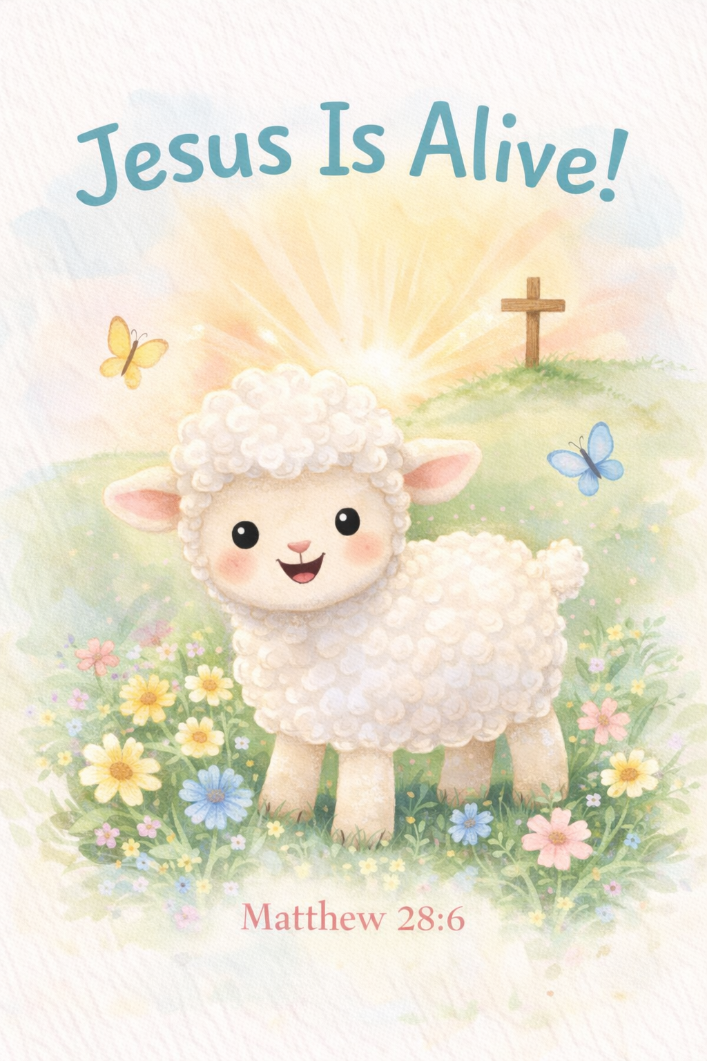 Brighten your child’s space with this joyful “JESUS IS ALIVE!” Matthew 28:6 Kids’ Easter Wall Art Printable. Designed with a smiling lamb, colorful spring flowers, butterflies, and a radiant cross on the hill, this artwork captures the wonder and excitement of the resurrection in a child‑friendly way.
