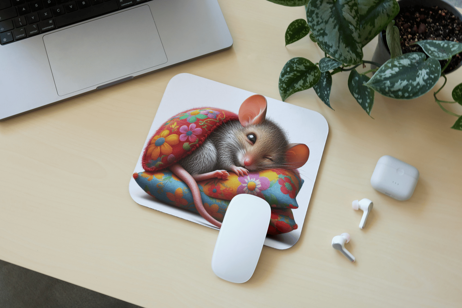 Bring charm and warmth to your workspace with this adorable mouse sublimation design! Featuring a cute mouse cozily snuggled on vibrant floral pillows, this design is perfect for creating a unique and personalized mouse pad. Ideal for animal lovers or anyone who enjoys adding a touch of whimsy to their desk.