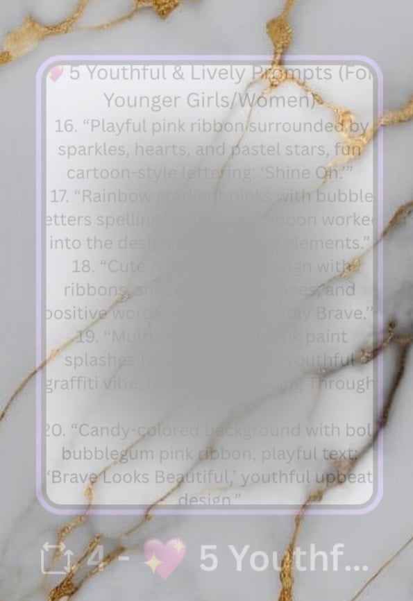 Bright, fun, and uplifting — this pack of 5 prompts is geared towards younger girls and women fighting the Breast Cancer battle earlier in life. With playful tones, multiple shades of pink, and youthful elements like sparkles, hearts, sneakers, and bubble lettering, these prompts generate vibrant, positive designs.