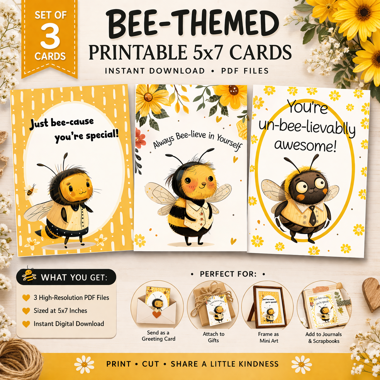 This adorable set of three printable 5x7 greeting cards features charming bee illustrations paired with playful, uplifting sayings. Each design has a cheerful, feel-good vibe that’s perfect for sending a little encouragement, appreciation, or just a sweet surprise “just because.”