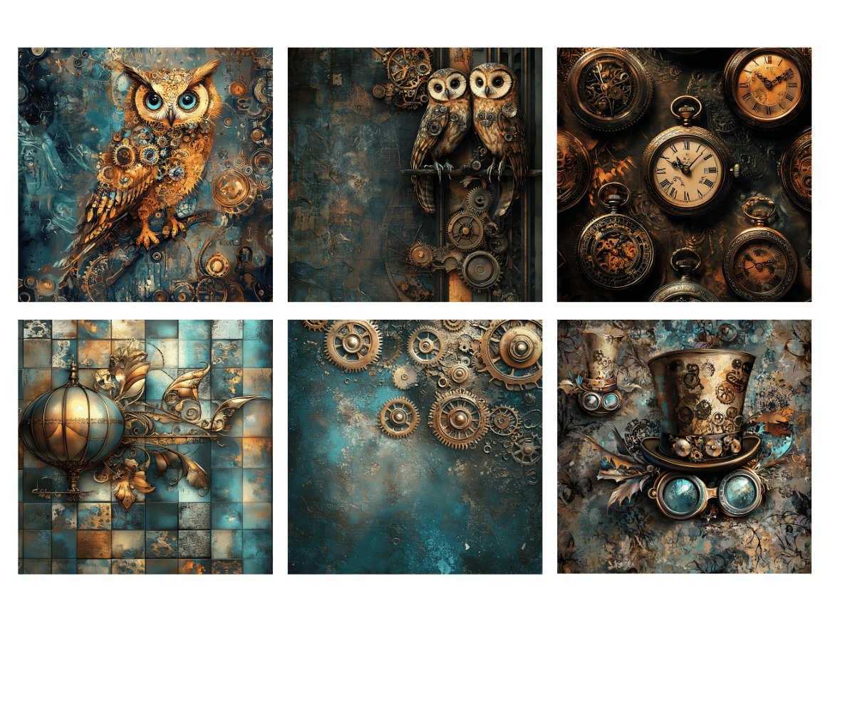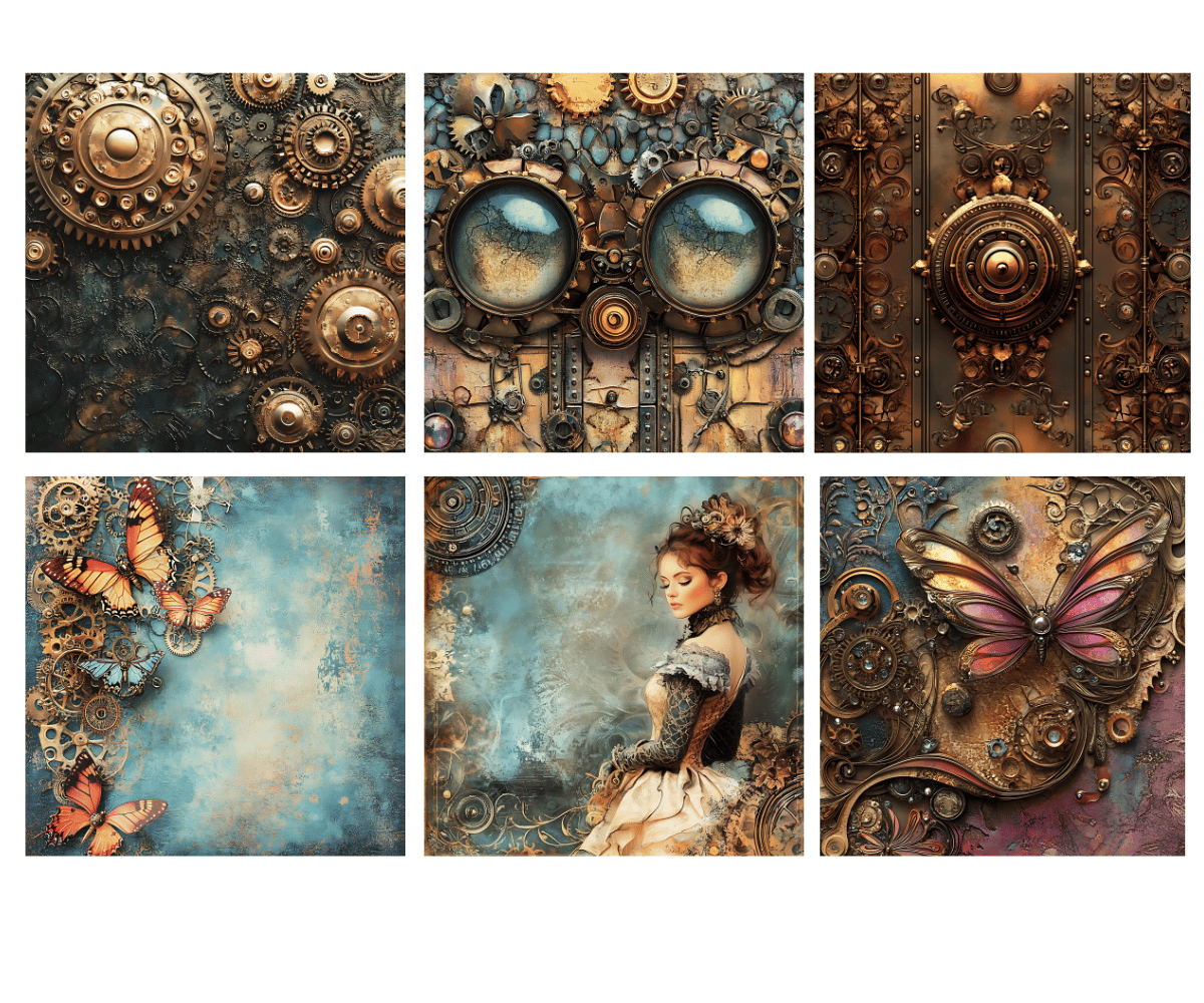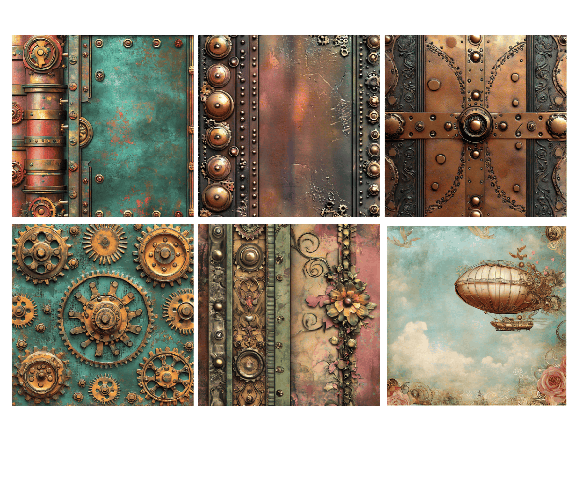 Elevate your crafting projects with our gorgeous Steampunk Digital Papers Volume 1 with 50 PNG available for commercial use. Perfect for instant download and sublimation design. Backgrounds include elegantly styled elements suitable for crafting projects in gorgeous tones. Ideal for digital art, printable clipart, and crafting, this set is a must-have for creating charming arts and crafts designs. In fact, cut them out and place them on your planners to make for an extra special gift for an organizer.