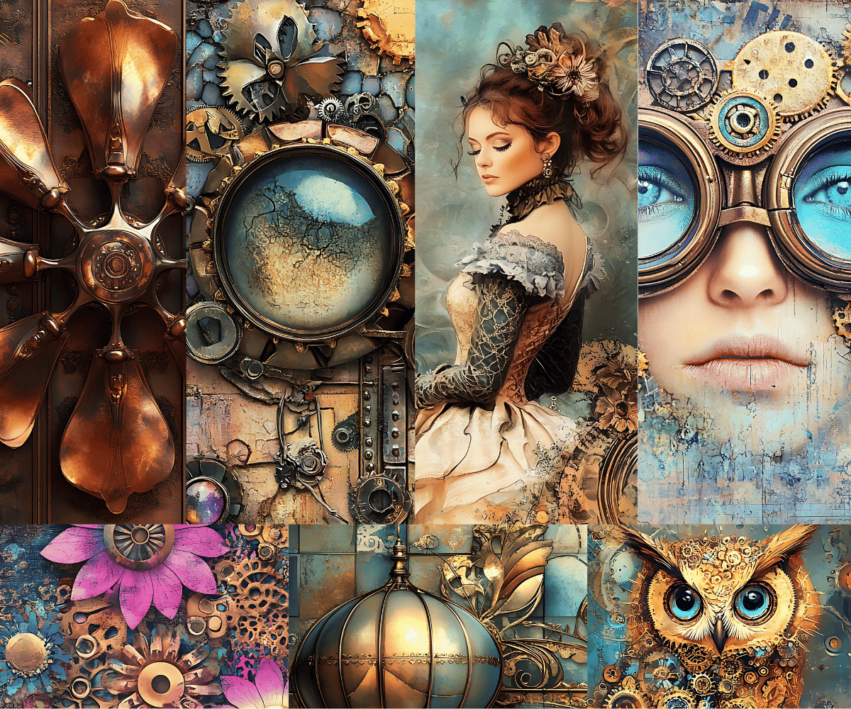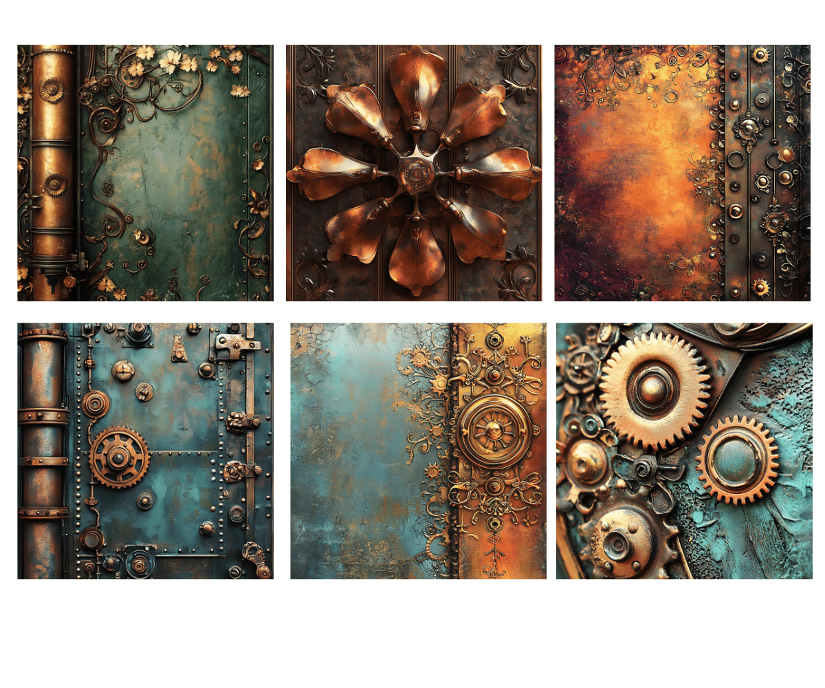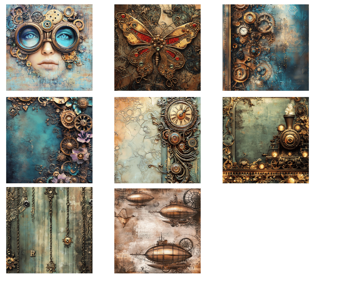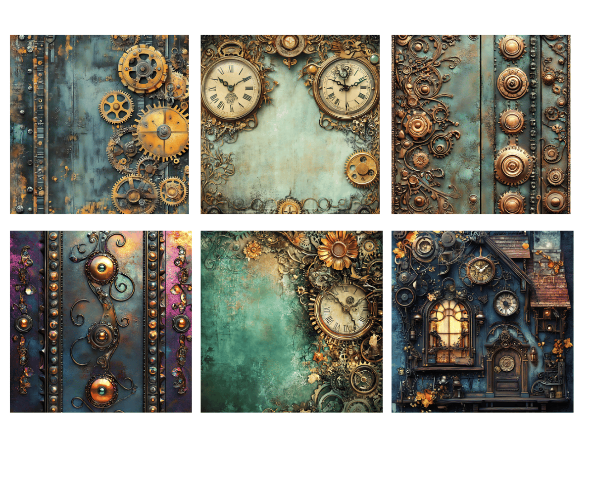 Elevate your crafting projects with our gorgeous Steampunk Digital Papers Volume 1 with 50 PNG available for commercial use. Perfect for instant download and sublimation design. Backgrounds include elegantly styled elements suitable for crafting projects in gorgeous tones. Ideal for digital art, printable clipart, and crafting, this set is a must-have for creating charming arts and crafts designs. In fact, cut them out and place them on your planners to make for an extra special gift for an organizer.