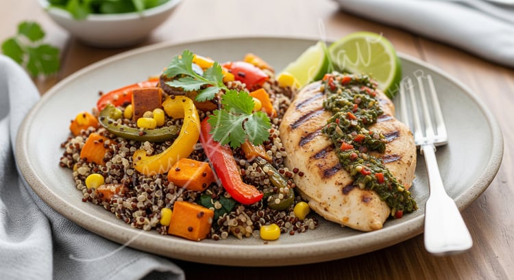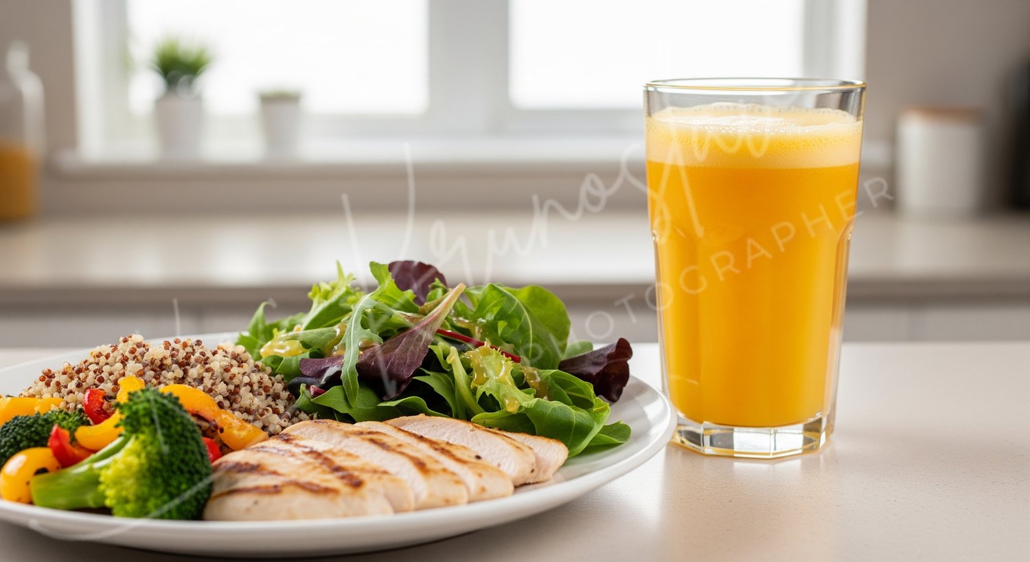 Tags: #healthyliving #grilledchicken #quinoabowl #mealprepinspo #wellnessphotography #cleaneating #fitnessnutrition #balancedmeal #orangejuice #stockimages