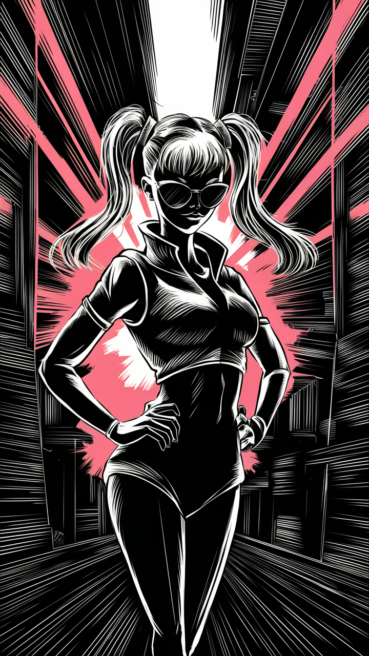 A stunning linocut illustration of an android girl with blonde hair in two pigtails, standing confidently in a world of black and white.
