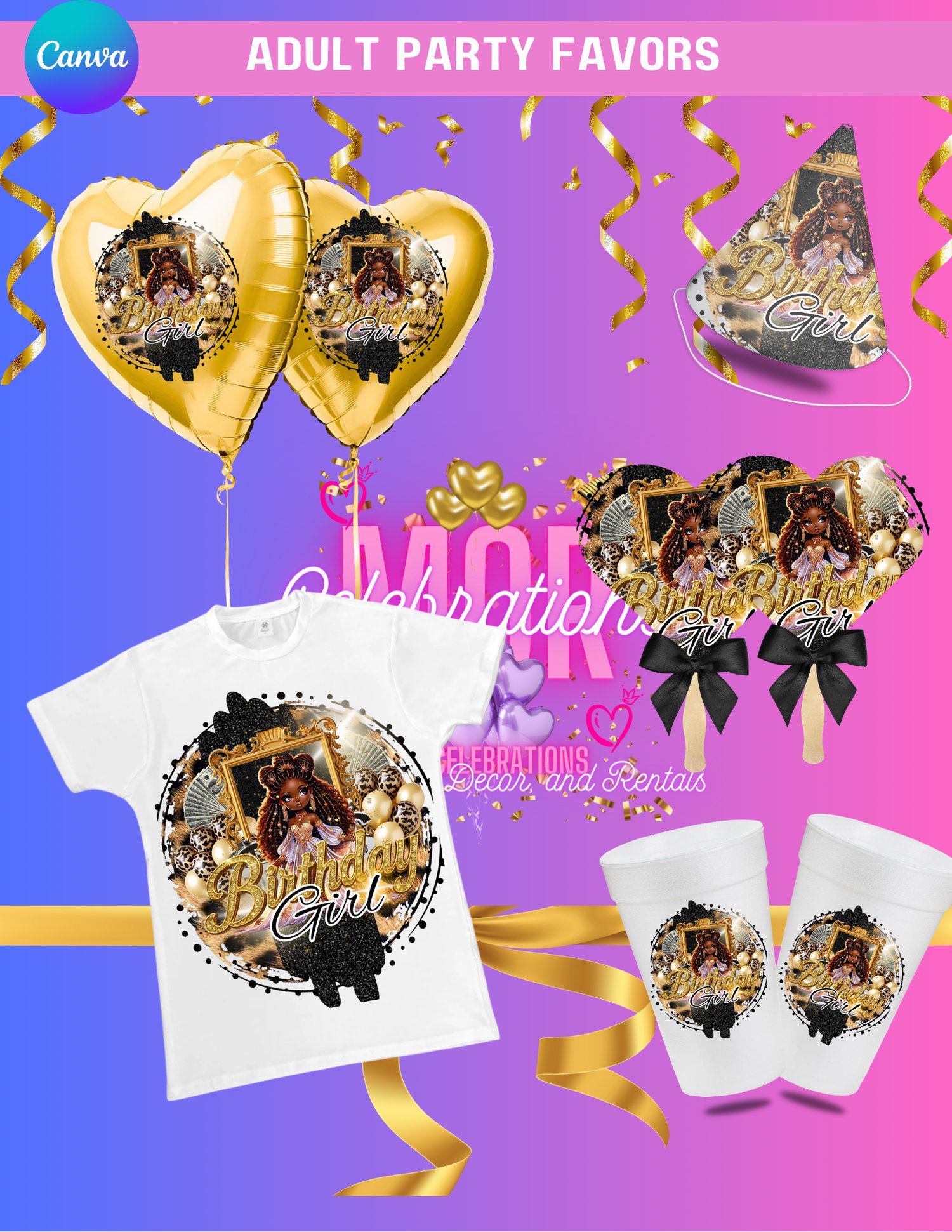 Elevate your next celebration with our Adult Party Favor Template, exclusively from MorCelebrations. This digital-only set offers instant download and features DIY Printable Party Favors, editable in Canva. Perfect for any adult celebration, the package includes a main design, cup or shot glass design, handheld fan, T-shirt design, and hat design.