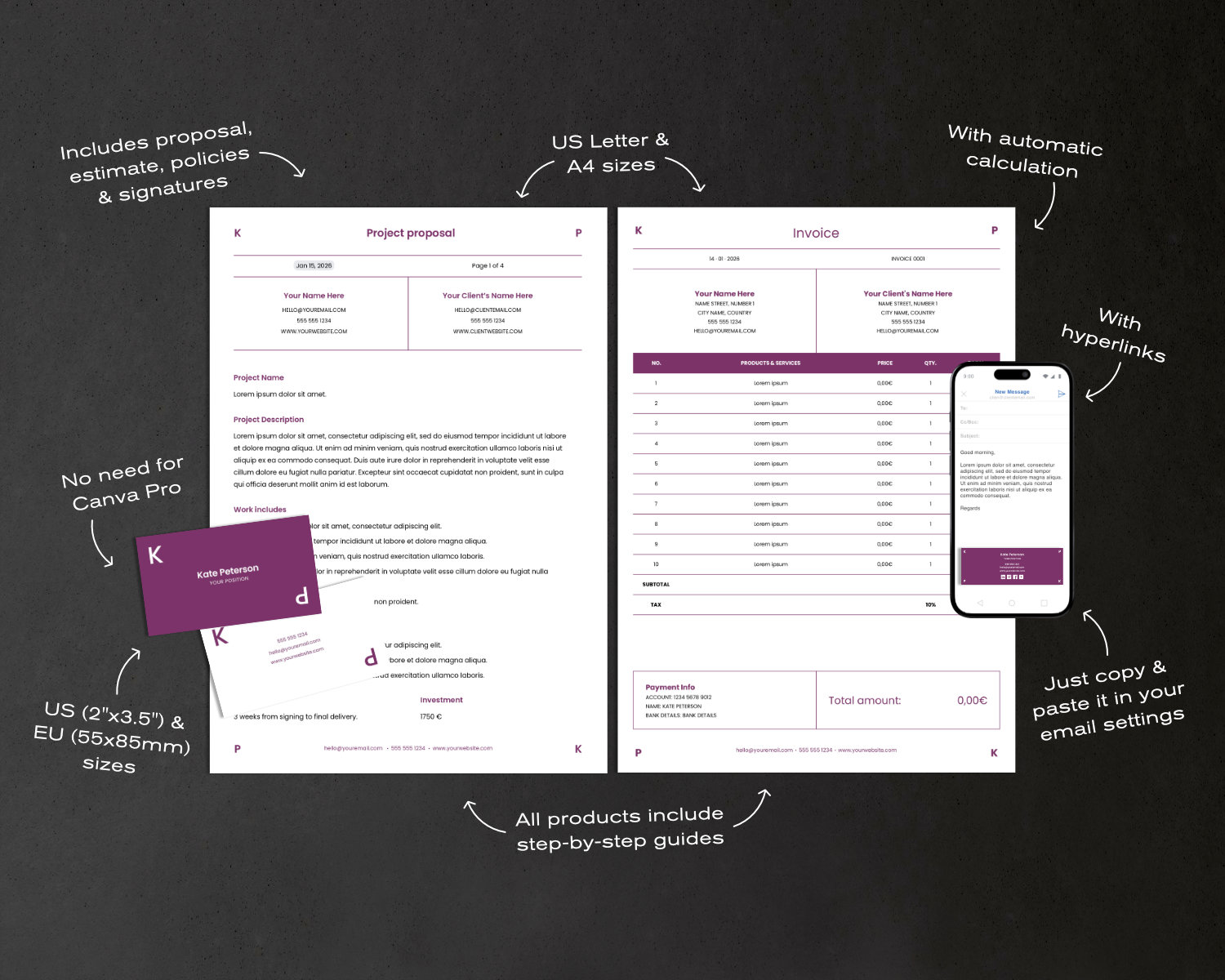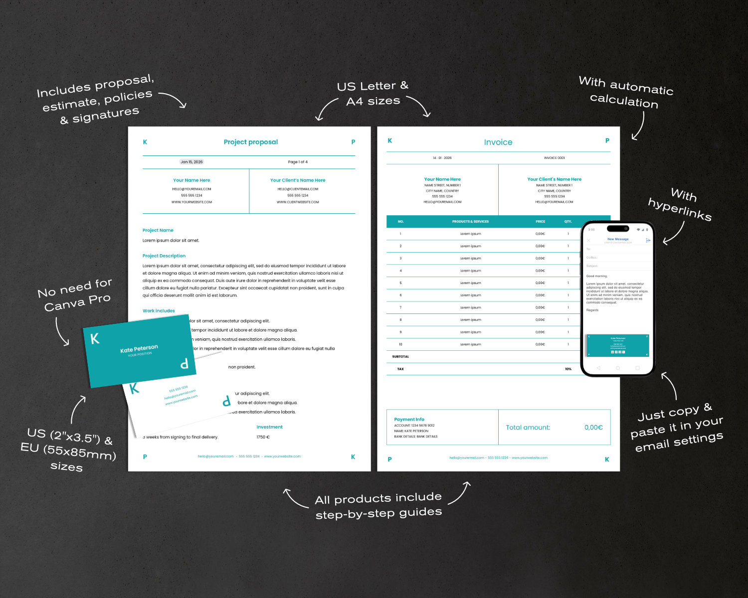 This business card template is part of a coordinated branding bundle designed for professionals who want a consistent and high-quality look across their business documents. The bundle includes: business card, invoice, project proposal, and email signature template. The bundle is not included in this listing.