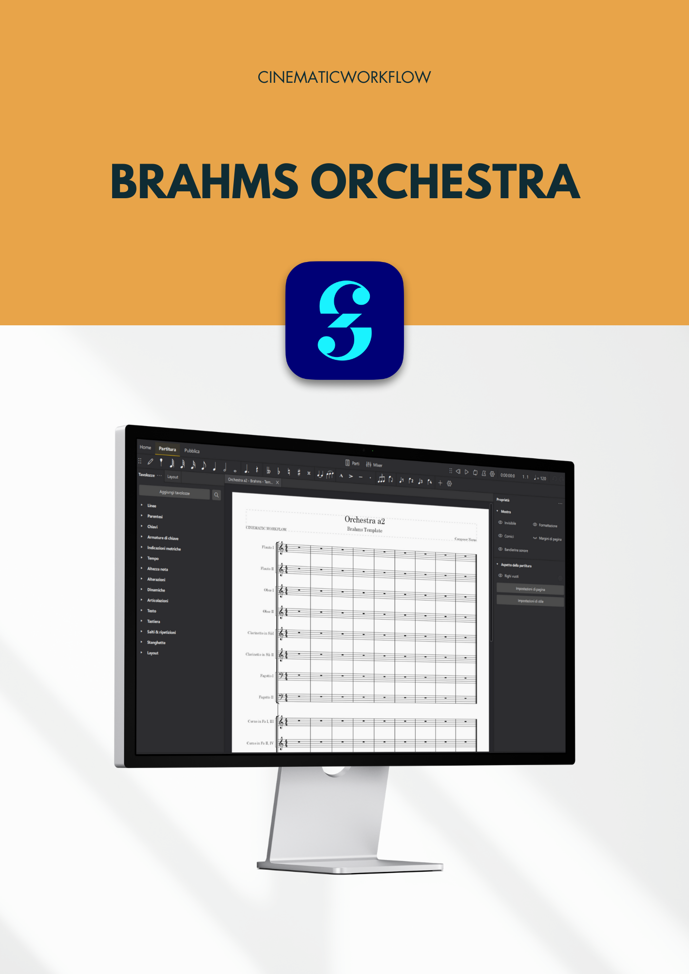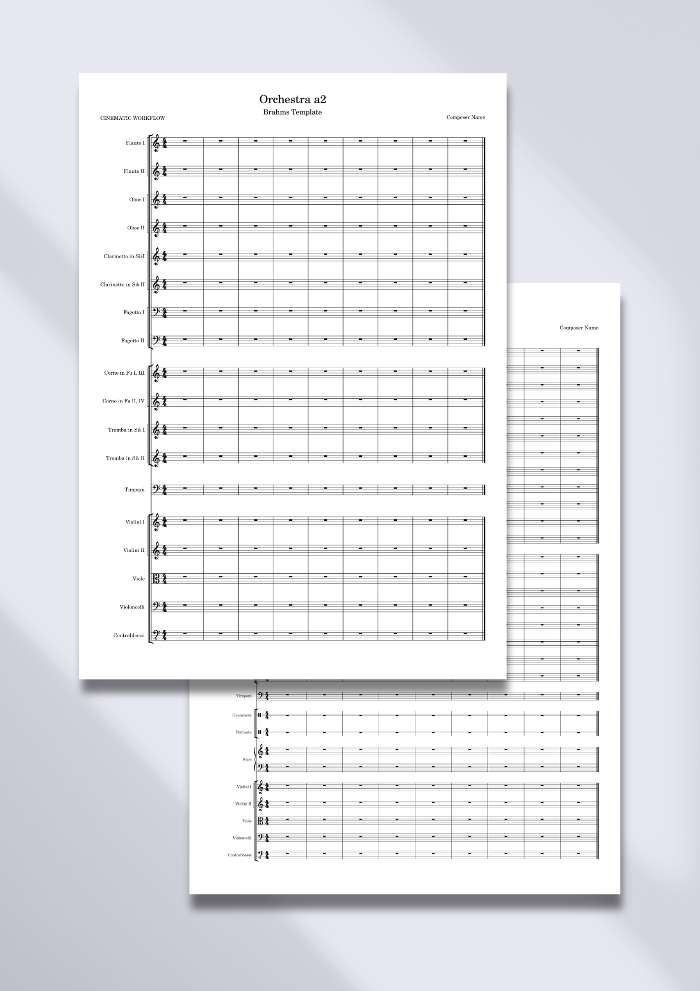 This MuseScore template is designed for composers seeking a refined and powerful orchestral foundation in the style of Johannes Brahms. It features a full a2 woodwind section (2 flutes, 2 oboes, 2 clarinets, 2 bassoons), already split across two staves for independent writing and greater visual control. The brass includes 4 horns and 2 trumpets, supported by timpani and a complete string section.